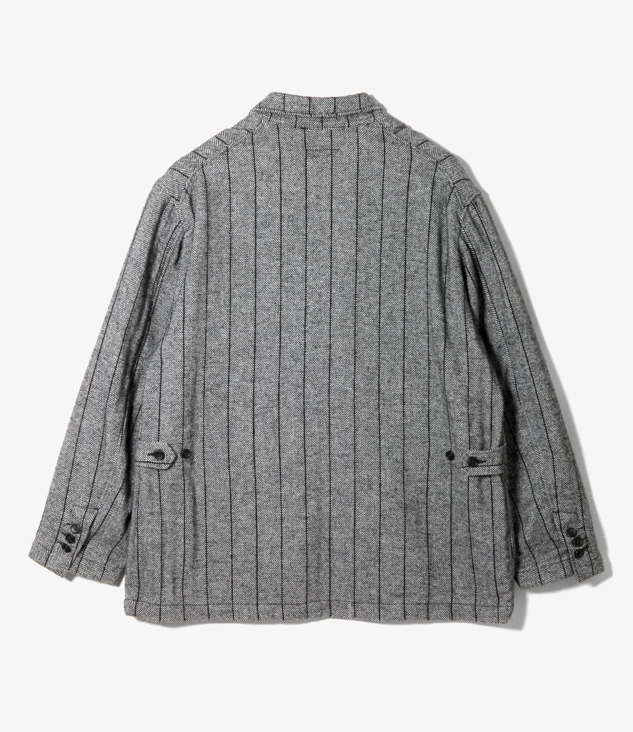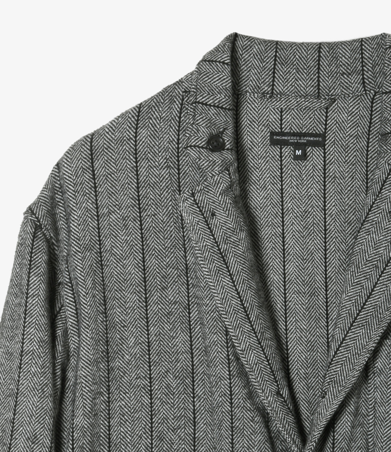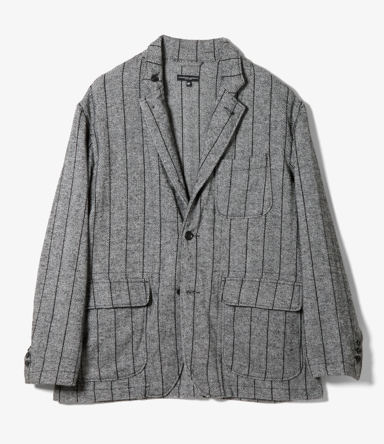ジャケットよりもシャツに近い、シンプルで簡素な構造が力の抜けたカジュアルな雰囲気を感じさせる定番ジャケット。ゆとりを持たせたシルエットや、裏地を省いた軽い仕立てによるライトさが最大の魅力です。シックなカラーのストライプ柄テキストでクラシックな印象。