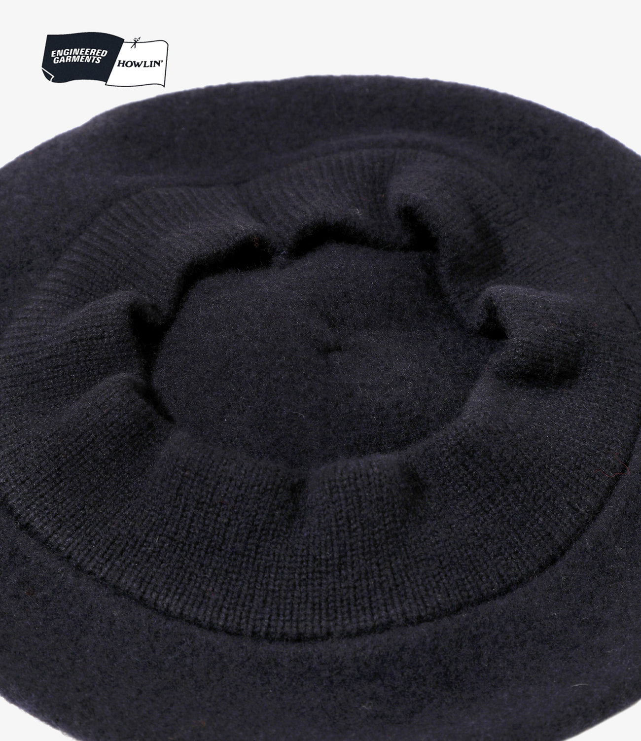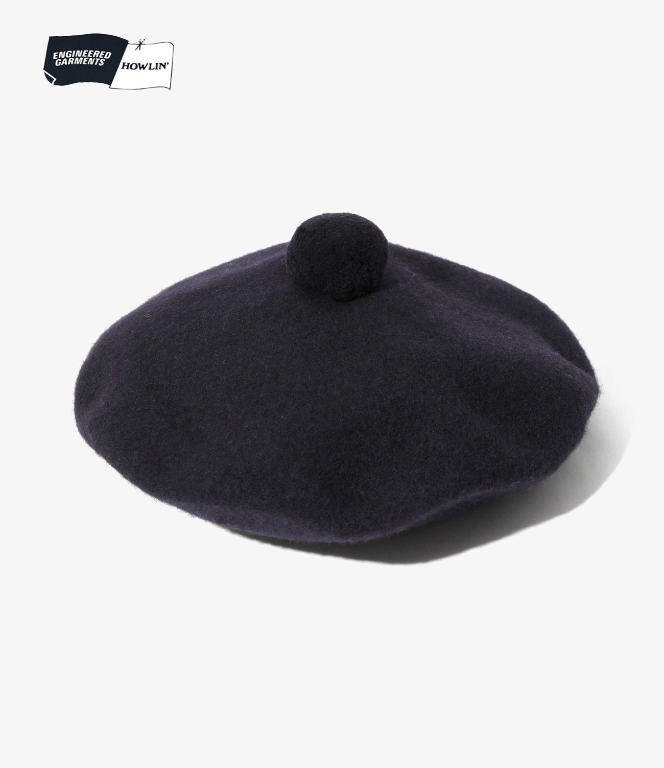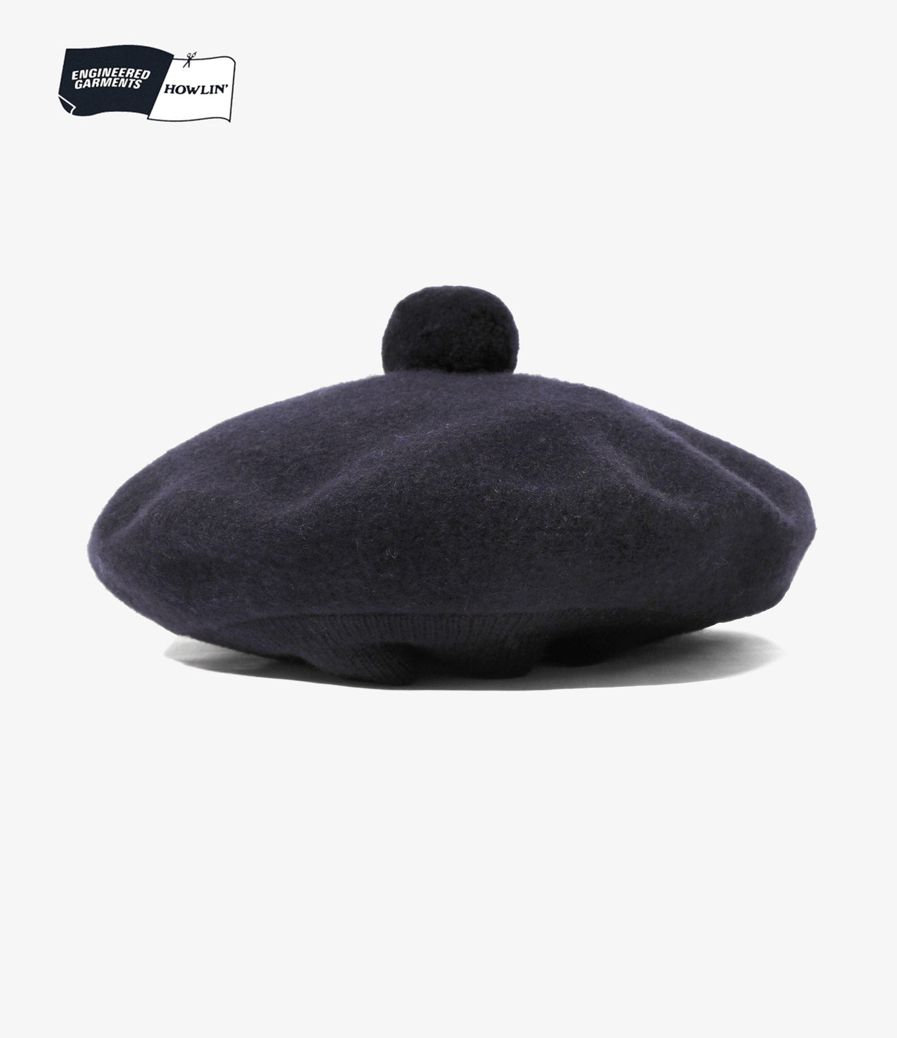ベルギー・アントワープのニットウェアブランド〈HOWLIN〉と〈ENGINEERED GARMENTS〉のコラボレーションが実現。2年以上の歳月をかけ開発された、スコットランド製のカスタムジャカードウールを使用したコレクションです。ソリッドなネイビーのウール素材を使用したベレー帽は、丸みのあるシルエットとトップの飾りが個性的です。
