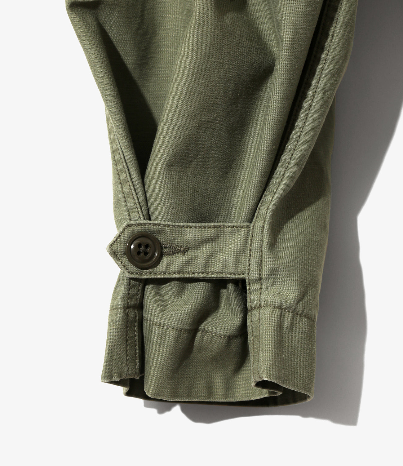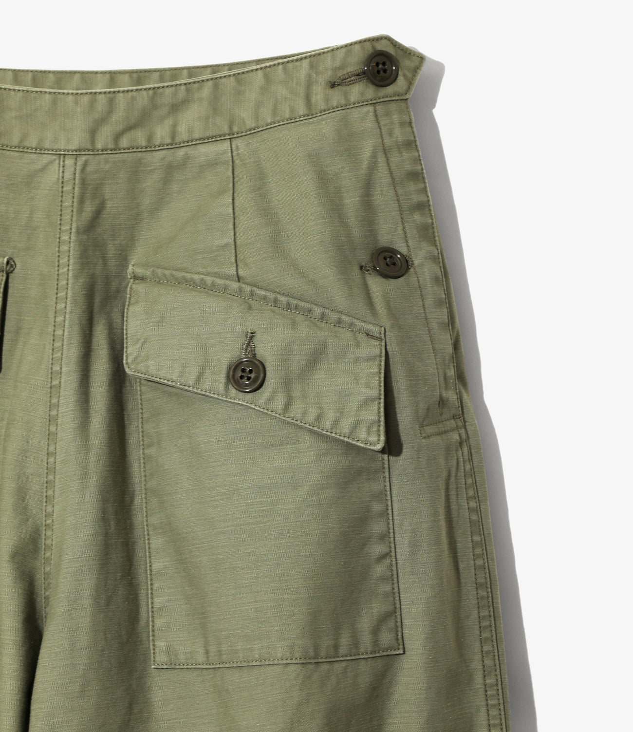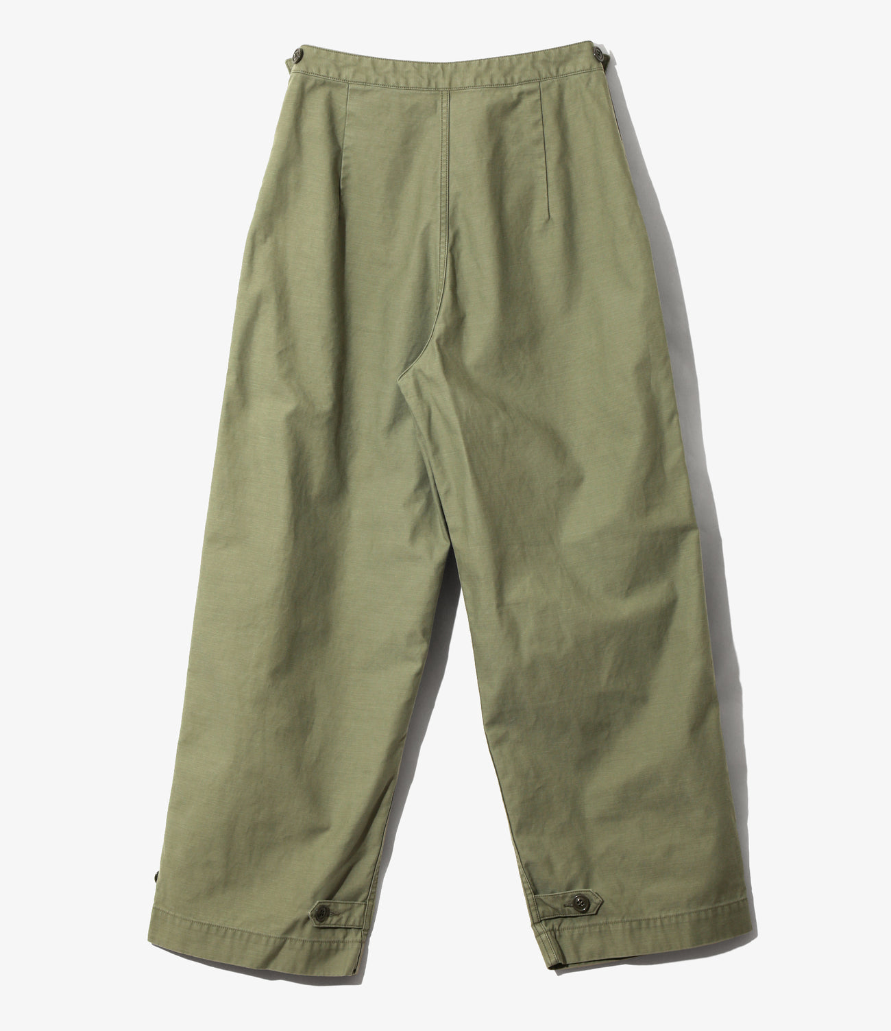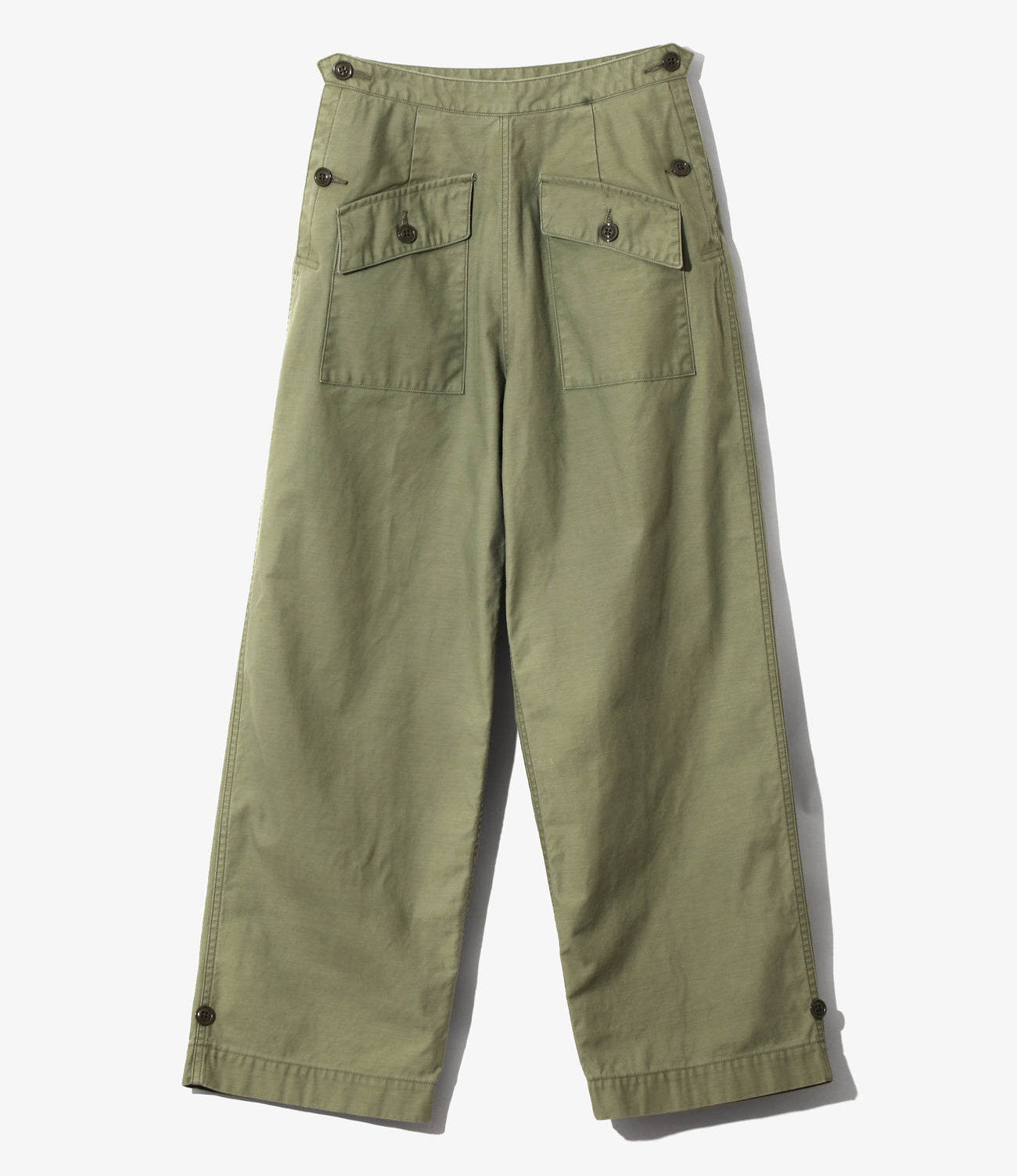 水兵の制服をモチーフにした、ボタンで開閉可能な前立てが特徴的なマリンパンツ。フラップポケットに裾部分のアジャストタブなど、細かいディテールが光る一本。ライトなオンスのサテン素材を使用しており、カジュアルにご着用いただけます。オリーブ、ブラックの2色展開となっております。