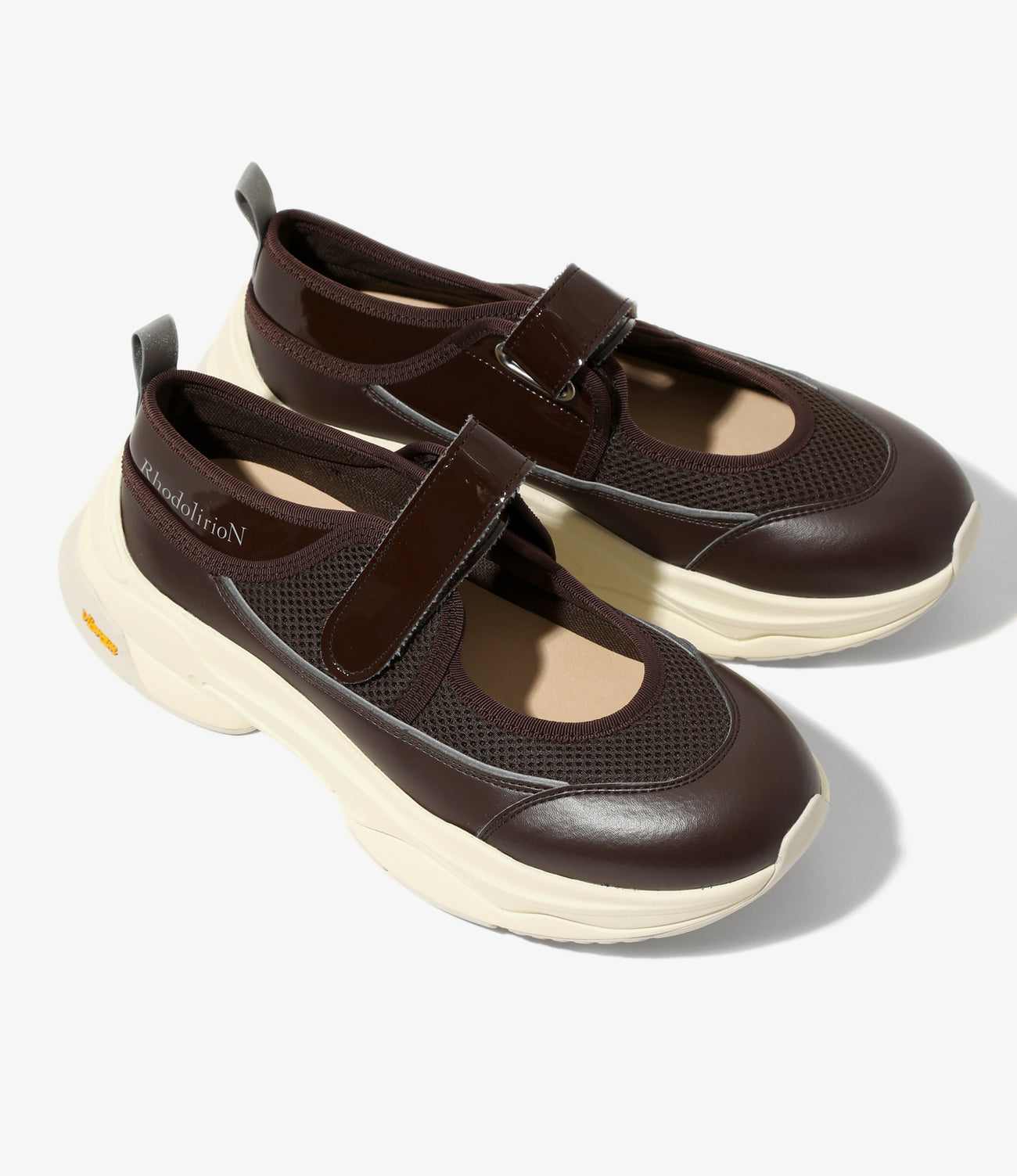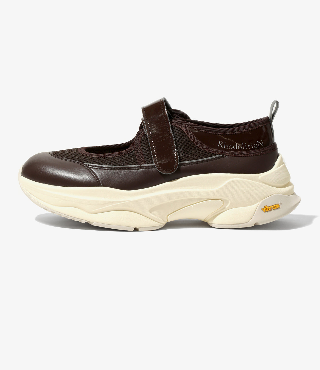 <RHODOLIRION>完全オリジナルのスニーカーです。ソールにはイタリアに本社があるヴィブラム (Vibram) 社が製造しているソールを採用しました。1930年代に登山ブーツ用ソール開発から始まり、80年以上の歴史を誇り、多くの有名靴メーカーから信頼を獲得しています。アッパーにはテクスチャーの異なる4種類の素材を使いコンビネーション、ヒールには<RHODOLIRION>ロゴを搭載、クラシックなレザーのメリージェーンシューズをイメージし、モダンに昇華した逸品。履き心地の良さはもちろん存在感のある1足です。