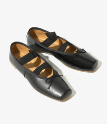 スクエアトゥのフォルムがクラシカルな印象のバレエシューズ。が付いているので、太幅のエラスティックストラップが大胆に2本配置されているのでホールド感に優れており履き心地抜群のひと品です。右側はラムカーフ調のフェイクレザー、左側はエナメル素材を採用し、同色異素材のネガティブタイプとなります。さりげないギミックと上品な光沢が魅力。ドレスにもパンツスタイルにも華やかさを添えてくれます。
