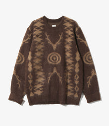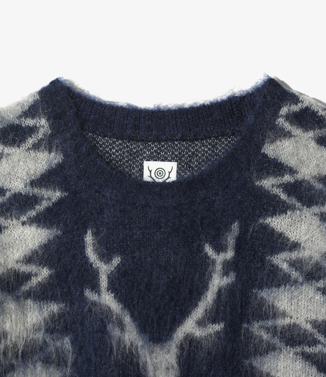 発色の良いモヘアで表現された個性的な柄が目を引くクルーネックセーター。スカル&ターゲットとアーガイルを掛け合わせた、〈SOUTH2 WEST8〉らしい遊び心の効いたパターンが印象的です。ルーズなワイドフィットで仕立てられており、リラックス感のある着心地が魅力。多くの空気を含む軽やかで保温性に優れたモヘア素材を、贅沢に使用した一着です。