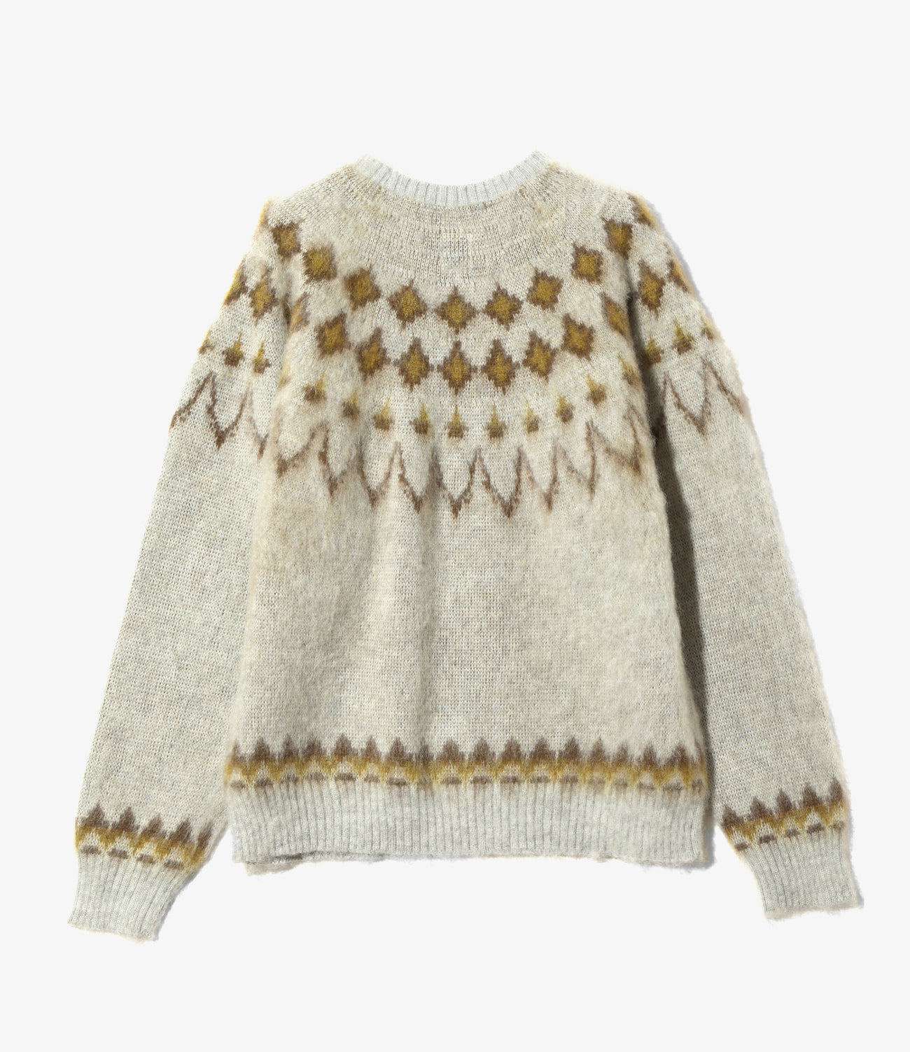 発色の良いモヘアで制作された、個性的なクルーネックセーターです。ニットの定番ノルディック柄に〈SOUTH2 WEST8〉らしいアレンジを加えたデザイン。空気を含む、軽快で保温性抜群のモヘア素材をたっぷりと使用した一着です。