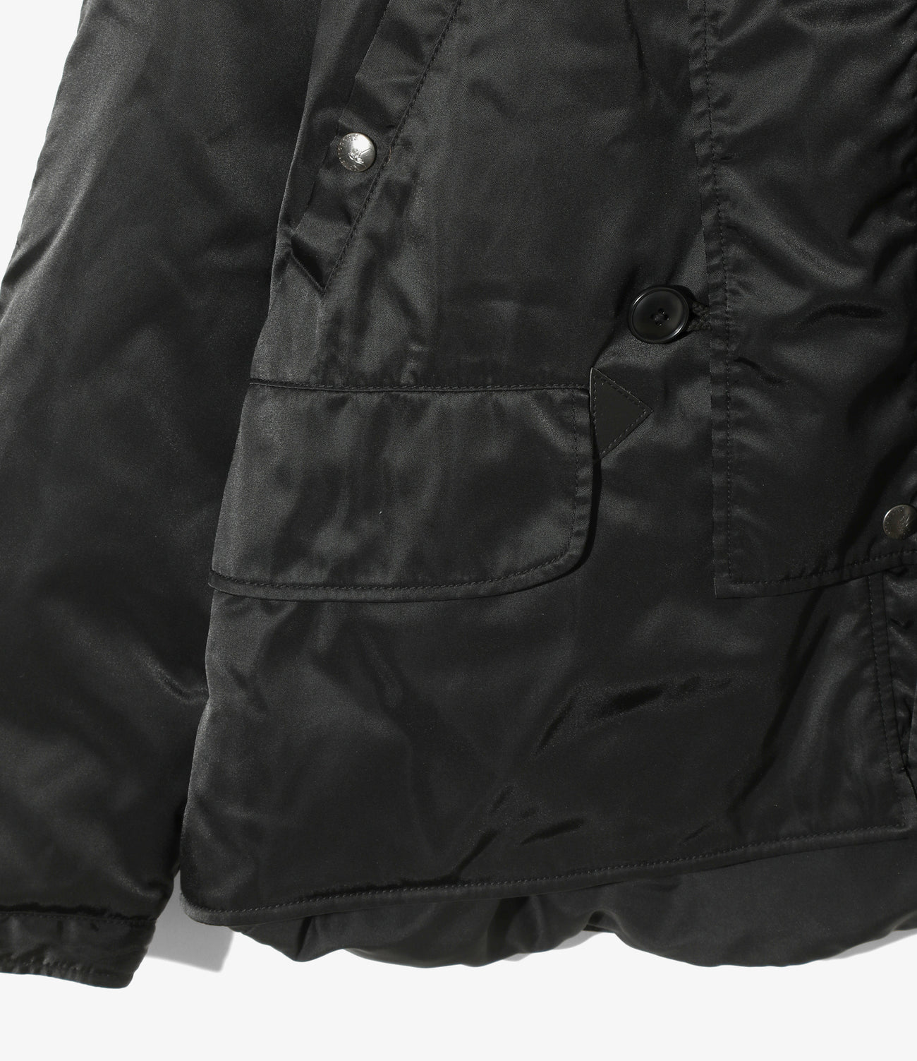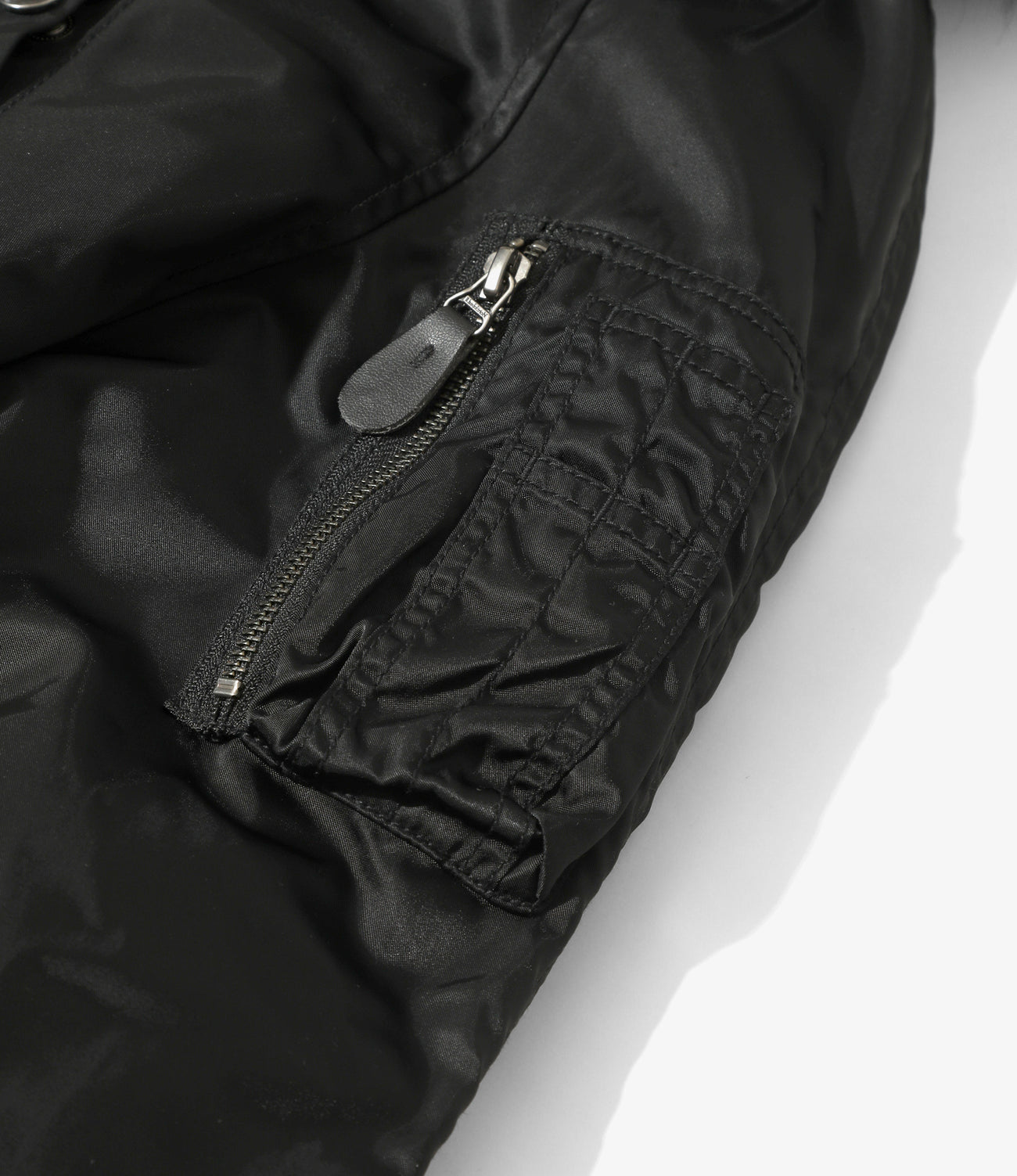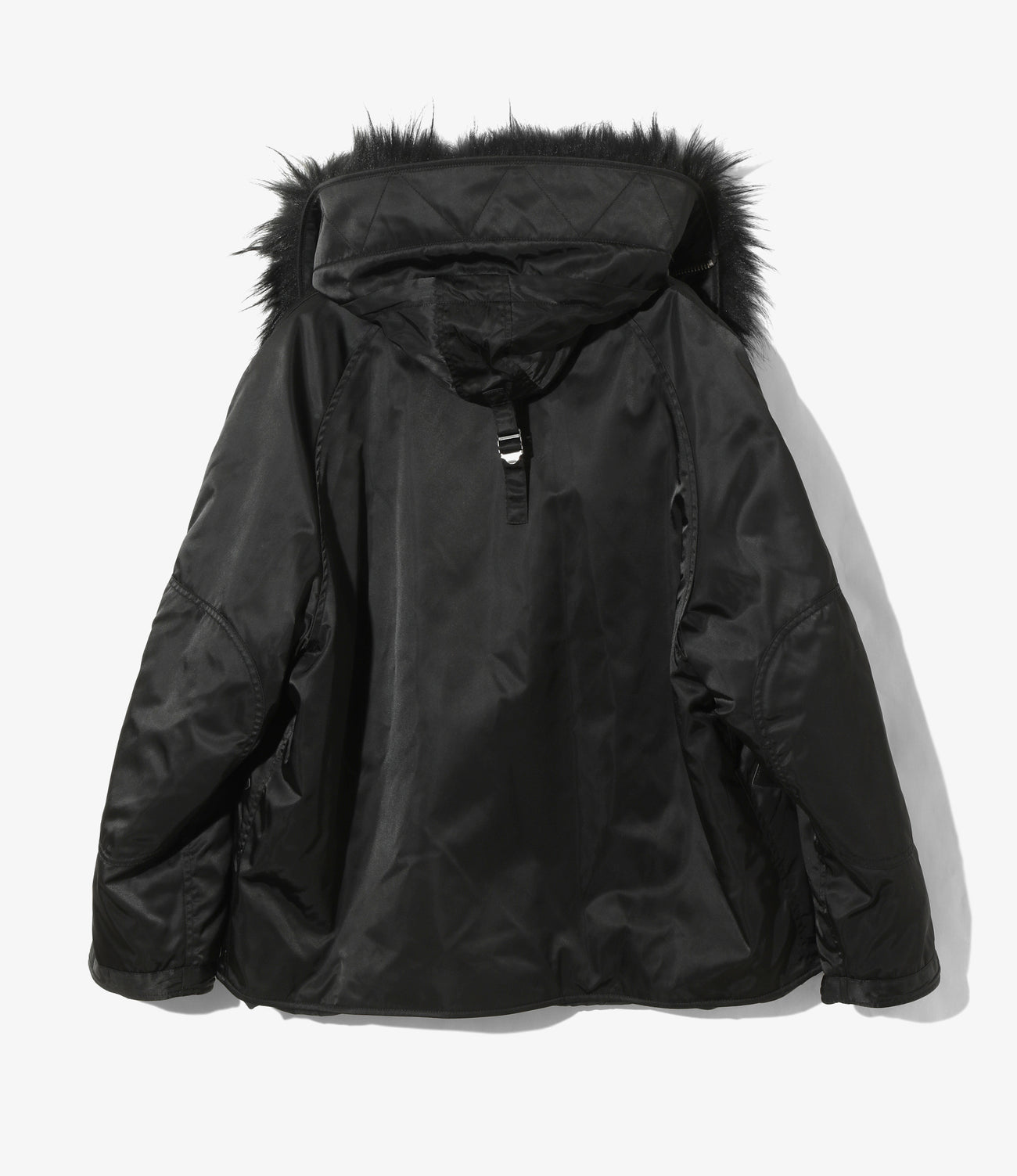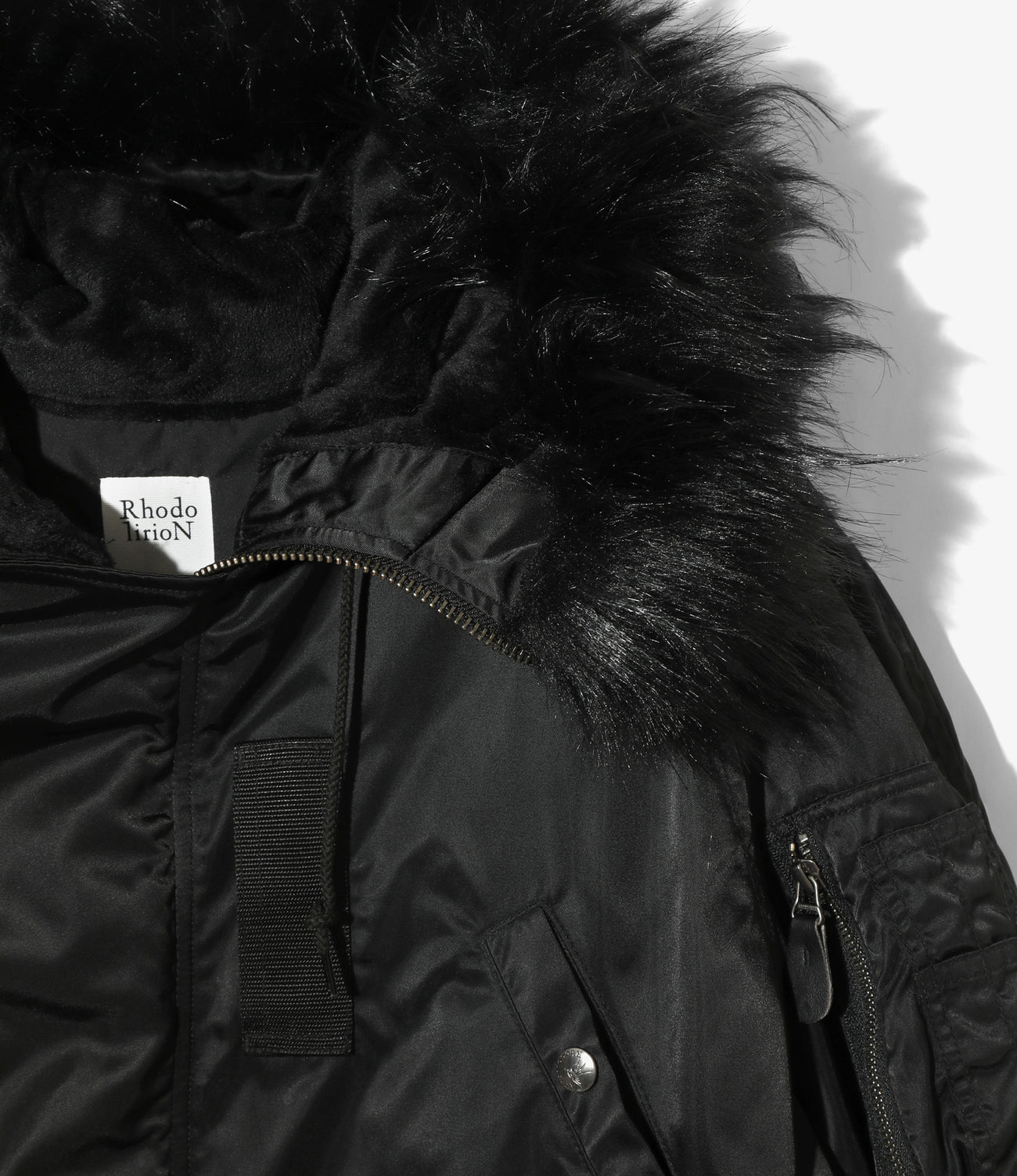 フライトジャケットType B-3をベースに、〈RHODOLIRION〉らしいフェミニンなアレンジを加えたハーフコート。肉厚でしなやかなナイロンツイル生地を使用し、フード内側はフリース、縁にはボリューム感のあるエコファーをあしらいました。袖口は風を防ぐリブ仕様、ポケット内は起毛素材で手を温められるなど、防寒性にも優れています。ゆったりとしたシルエットに、なだらかな肩のラインが女性らしさを演出する一着です。