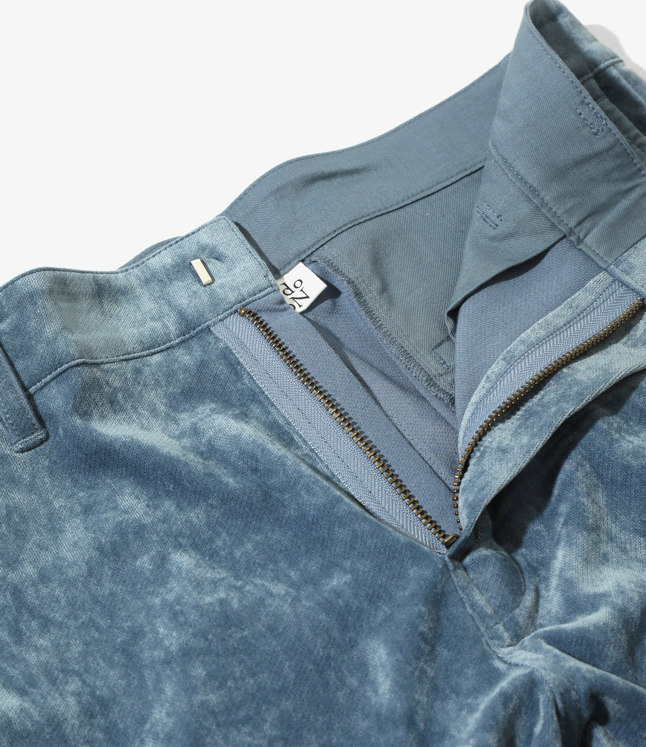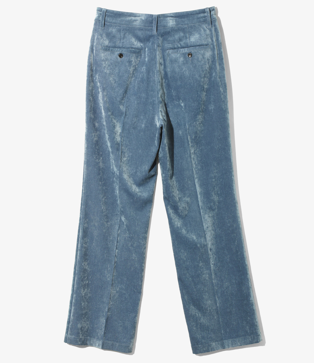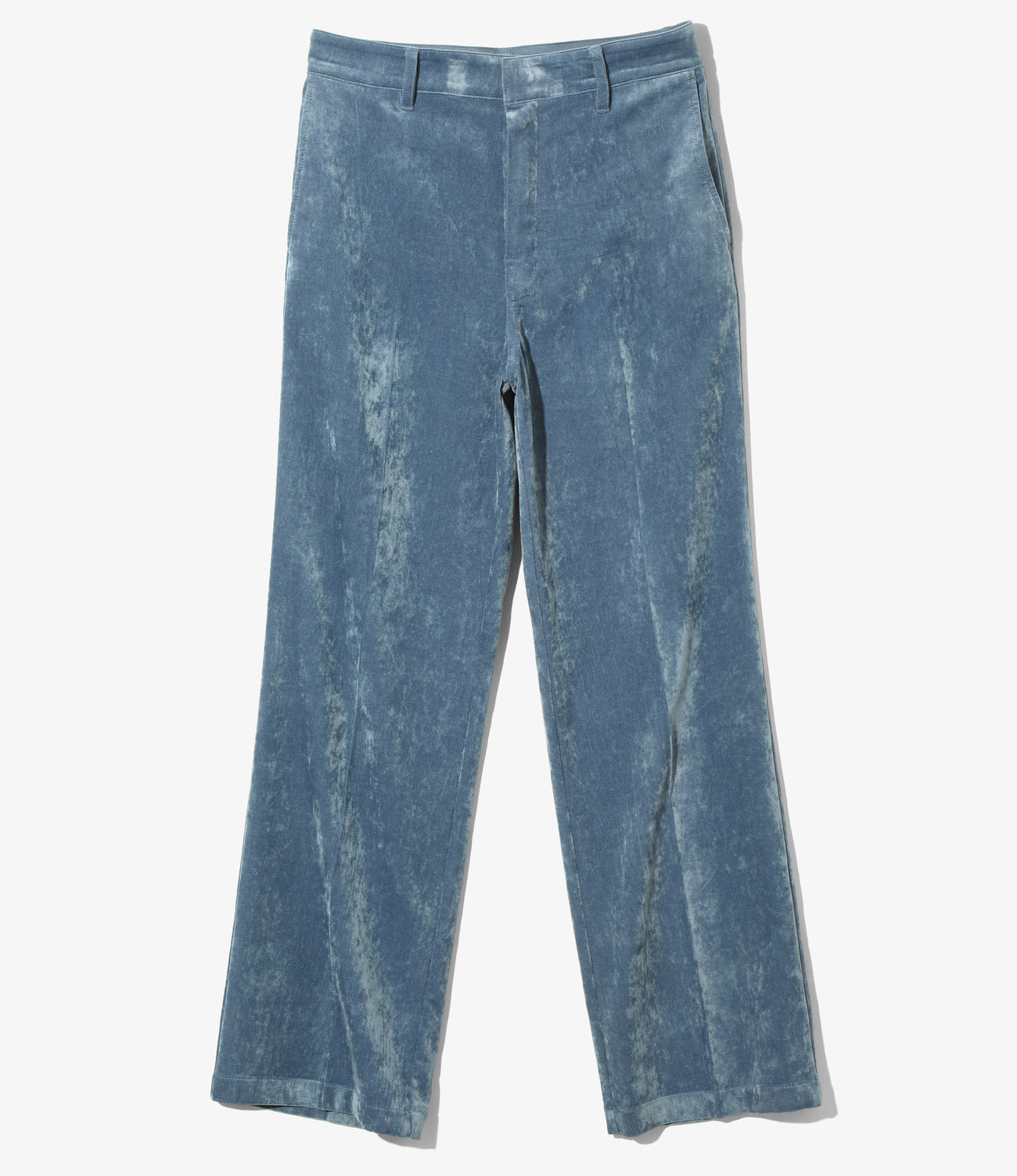 軍の士官や将校が着用していたパンツをデザインソースとし採用した、センタープレスで美しいラインのスラックスです。細身ですっきりとしたシルエットが特徴で、上品かつカジュアルに着こなせるのが魅力。素材は光沢のあるレーヨン糸を使用した別珍素材です。上質な光沢とソフトな肌触りが特徴です。