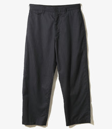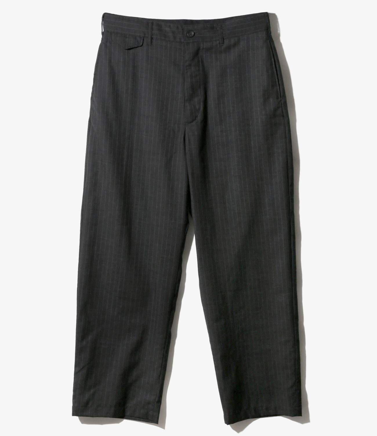 NEPENTHES直営店舗のみで展開される〈ENGINEERED GARMENTS〉のエクスクルーシブアイテム。シンプルなデザインと独特のテーパードシルエットが特徴的な、汎用性の高い一本です。チョークストライプのウーステッドウール素材を使用し、高級感のある表情に仕上がっています。
