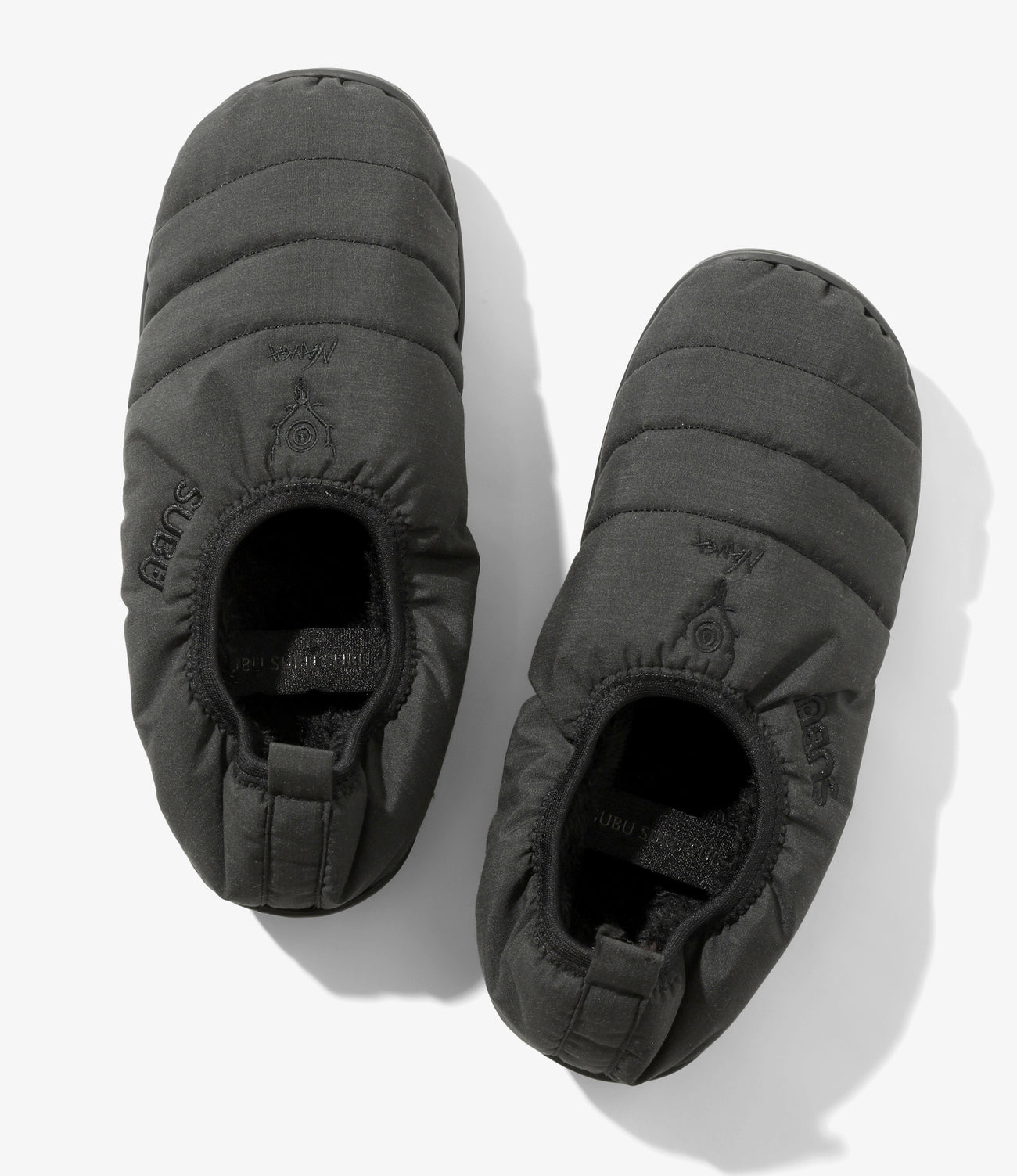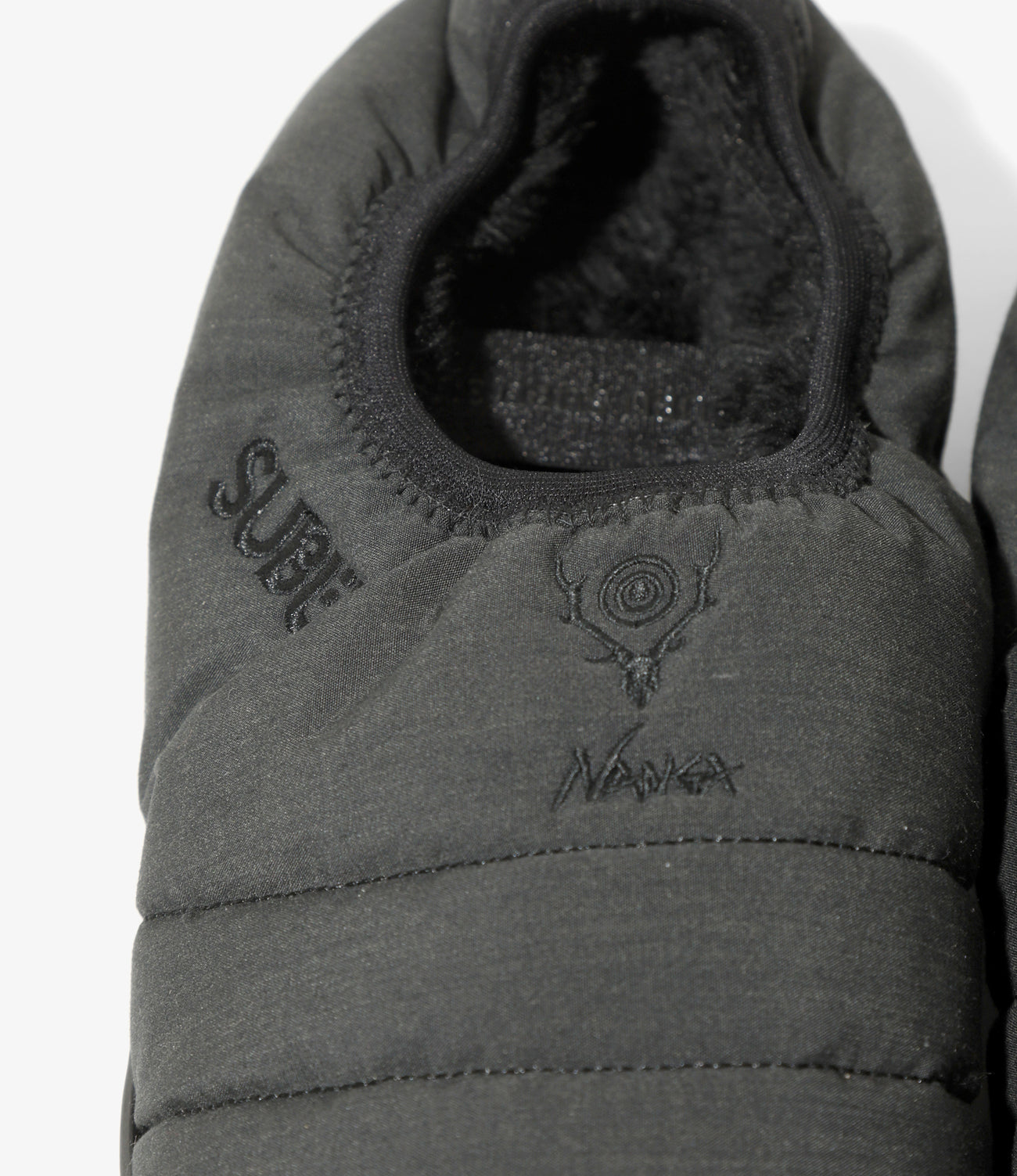 ベースには〈SUBU〉2025年秋冬新モデル「VAMP」を採用。同ブランド新開発の" HEXMAX INSOLE™️ "は、六角形構造の多層クッションで歩行時の衝撃を吸収し、反発力で推進力をサポート。沈み込みすぎず安定感があり、〈SUBU〉史上最高の履き心地を実現しています。表地には〈NANGA〉独自の難燃素材" HINOC "を使用。焚き火の火の粉にも強く、タウンユースからアウトドア・キャンプまで幅広く活躍します。アッパーには3ブランドのロゴ刺繍が施され、特別な一足に仕上がりました。パッカブル仕様で、専用のメッシュバッグも付属します。