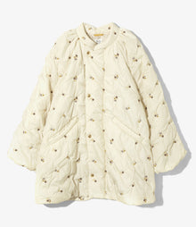 高密度ポリエステルタフタに愛らしい小花柄刺繍を施した、<RHODOLIRION>のスペシャルファブリックを使用しました。今シーズンは収縮糸を使用し、より立体的なフォルムを実現。中綿は軽くて温かく、ラグラン袖の肩山部分にタックを寄せることで、コンパクトに見せる立体感を演出。Aラインのミドル丈で、どんなボトムスとも相性が良く、程よいハリ感がシルエットをキープします。ベスト、フーディスカーフ、マルチエプロンなど全4アイテムがシリーズで登場。