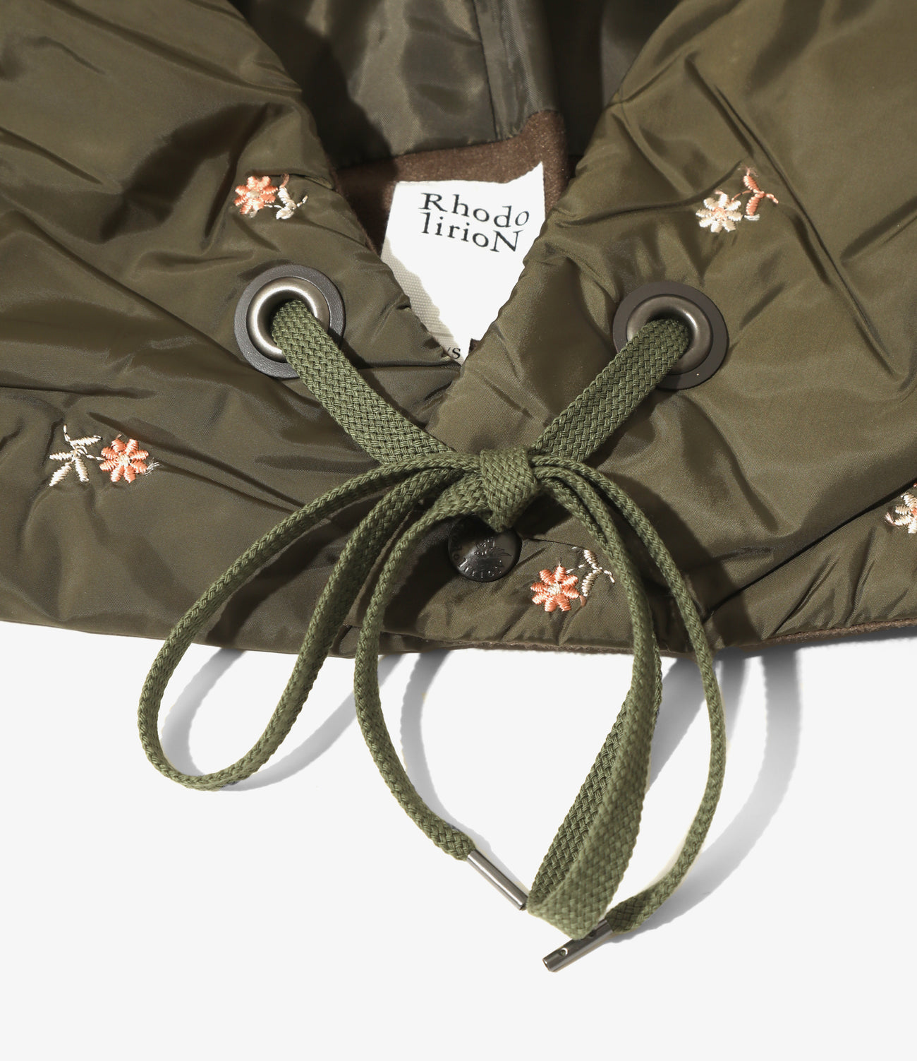 昨年人気を博したシリーズがブラッシュアップして再リリース。高密度のポリエステルタフタに愛らしい小花柄の刺繍を施した<RHODOLIRION>のスペシャルファブリックです。今シーズンは収縮糸を使用することでより立体的なフォルムを実現し、フィリングには軽くて温かいポリエステル中綿が打ち込まれています。フードにもマフラーにも活用できるフーディスカーフです。首元にはスナップボタンとドローコードが搭載されており、贅沢な素材、分量感が際立つミニマルな作りです。同素材ではコートとベスト、マルチに使えるエプロンの全4モデルです。