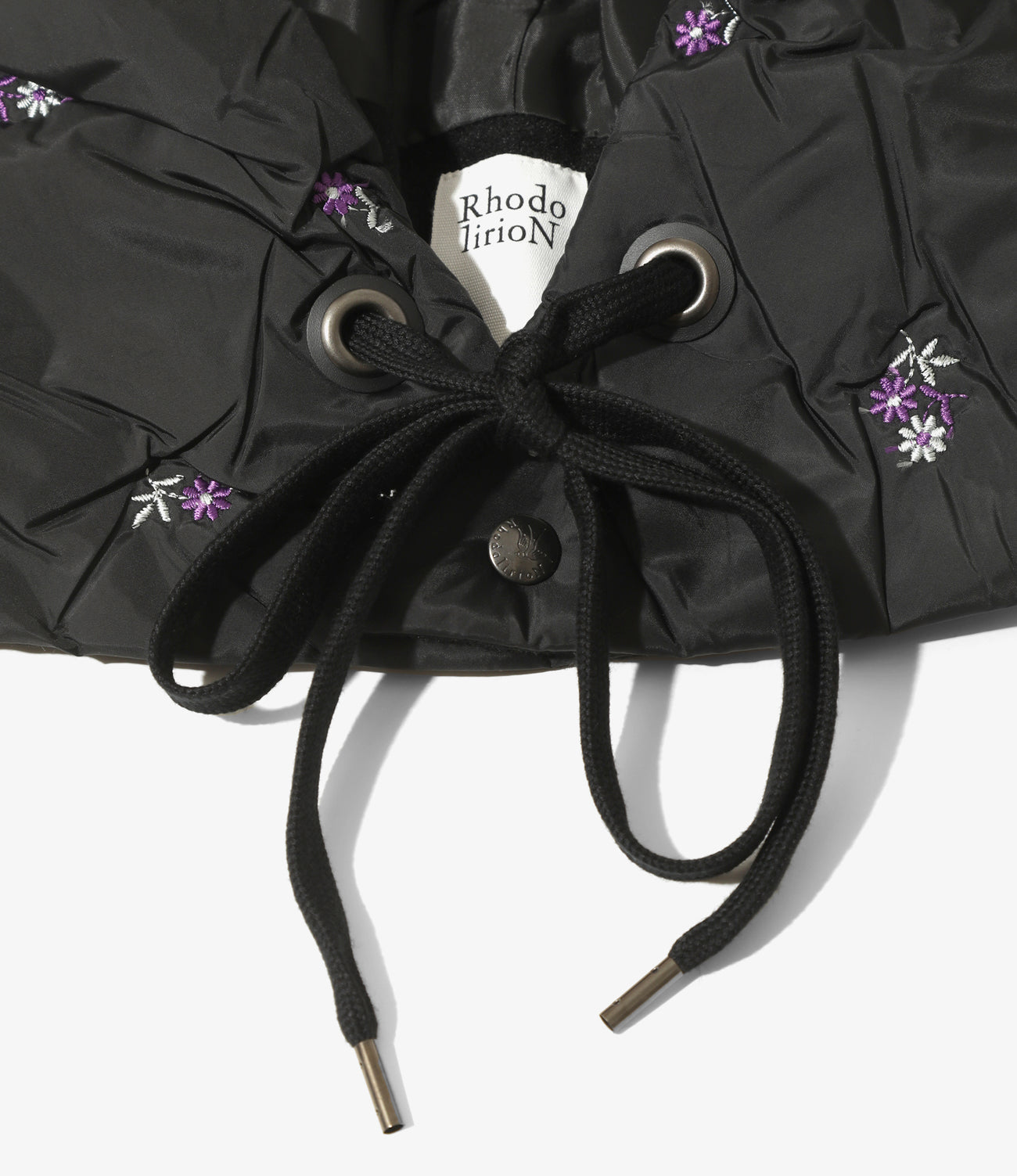 昨年人気を博したシリーズがブラッシュアップして再リリース。高密度のポリエステルタフタに愛らしい小花柄の刺繍を施した<RHODOLIRION>のスペシャルファブリックです。今シーズンは収縮糸を使用することでより立体的なフォルムを実現し、フィリングには軽くて温かいポリエステル中綿が打ち込まれています。フードにもマフラーにも活用できるフーディスカーフです。首元にはスナップボタンとドローコードが搭載されており、贅沢な素材、分量感が際立つミニマルな作りです。同素材ではコートとベスト、マルチに使えるエプロンの全4モデルです。