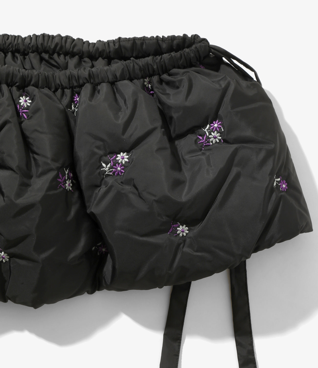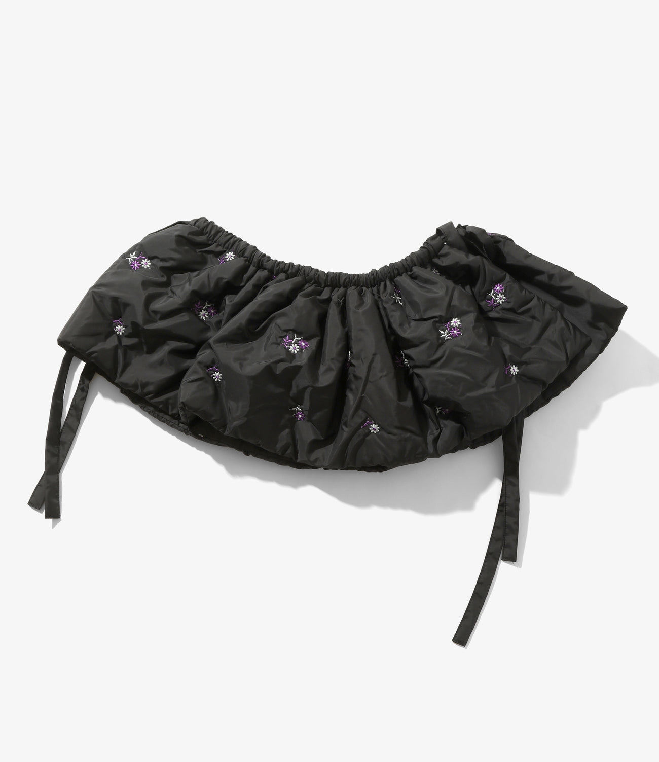 高密度のポリエステルタフタに愛らしい小花柄の刺繍を施した<RHODOLIRION>のスペシャルファブリック。今シーズンは収縮糸を使用することでより立体的なフォルムを実現し、フィリングには軽くて温かいポリエステル中綿が打ち込まれています。襟だけでなく、ウエストアクセントや、斜め掛けなど普段のお洋服を惹き立てるほか、内側にはポケットも搭載しているのでバッグとしての機能も持っています。同素材ではコートとベスト、フーディマフラーのの全4モデルです。