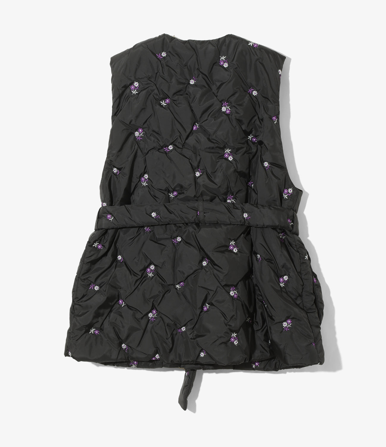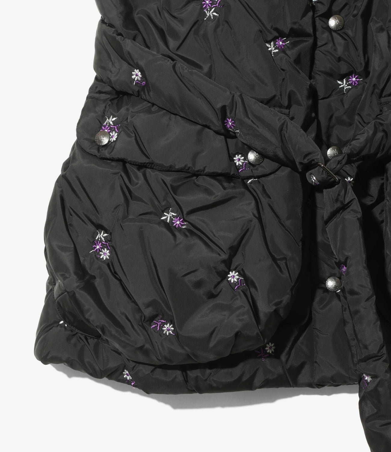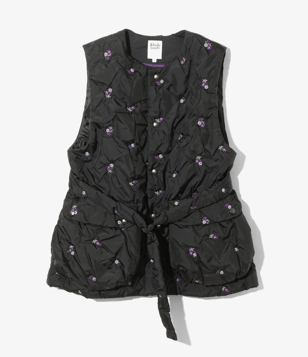 高密度ポリエステルタフタに、愛らしい小花柄刺繍を施した<RHODOLIRION>のスペシャルファブリックを使用。中綿は軽くて温かく、今シーズンは収縮糸を使って立体的なフォルムに仕上げました。英国のモーターサイクルジャケットから着想を得た、大きなキャリーポケットと共地のベルトが特徴的です。コート、フーディスカーフ、マルチエプロンなど、全4アイテムがシリーズで展開。