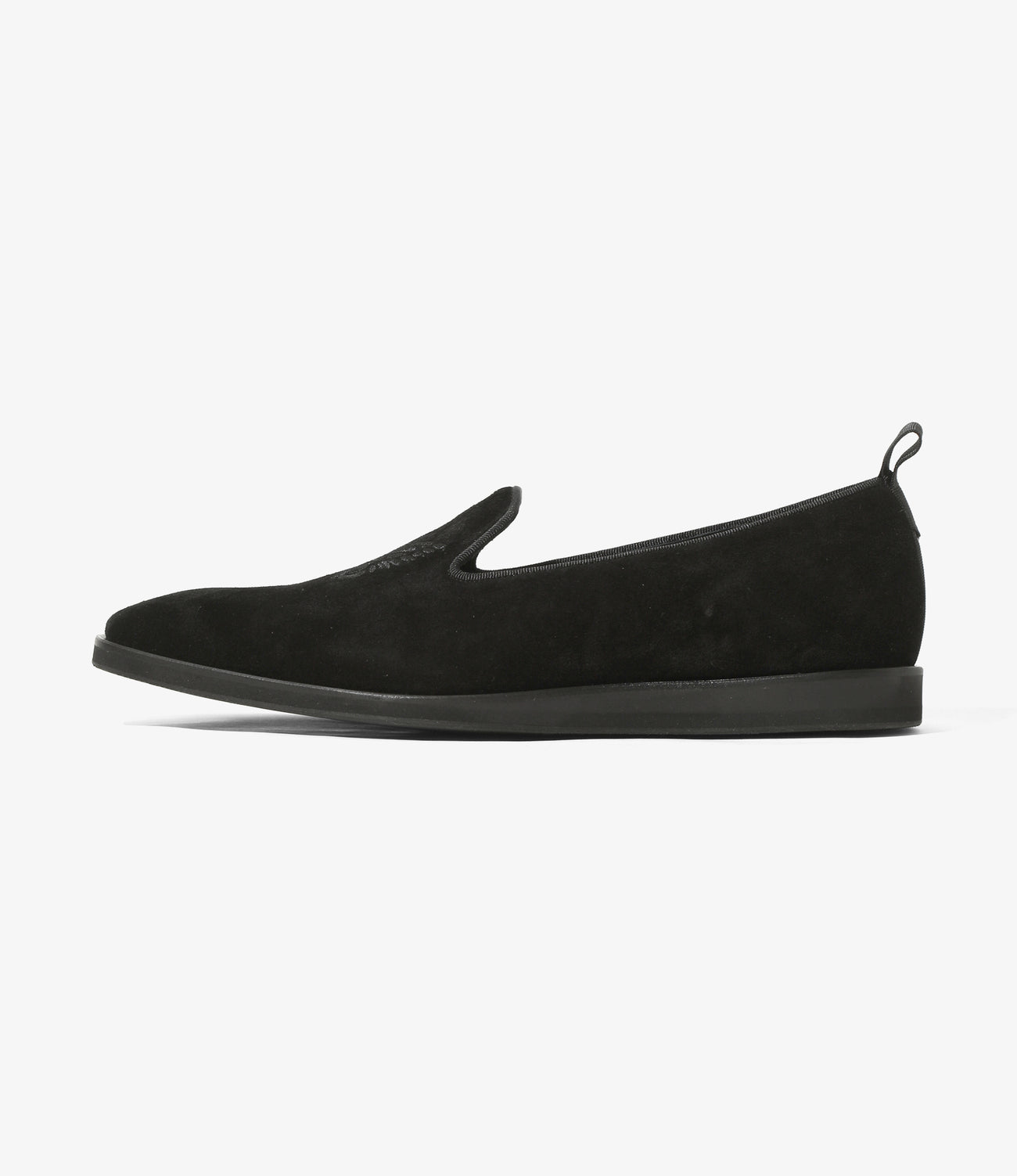 アッパーのパピヨン(蝶)刺繍が特徴的なスリッポン型の一足です。適度なドレス感とカジュアルさを兼ね備え、さまざまなタイプのボトムスと相性の良さを発揮します。ソールは〈VIBRAM〉ソールを採用し、軽快で歩行性も高い仕上がりとなっています。ブラウンとブラックの2色展開。