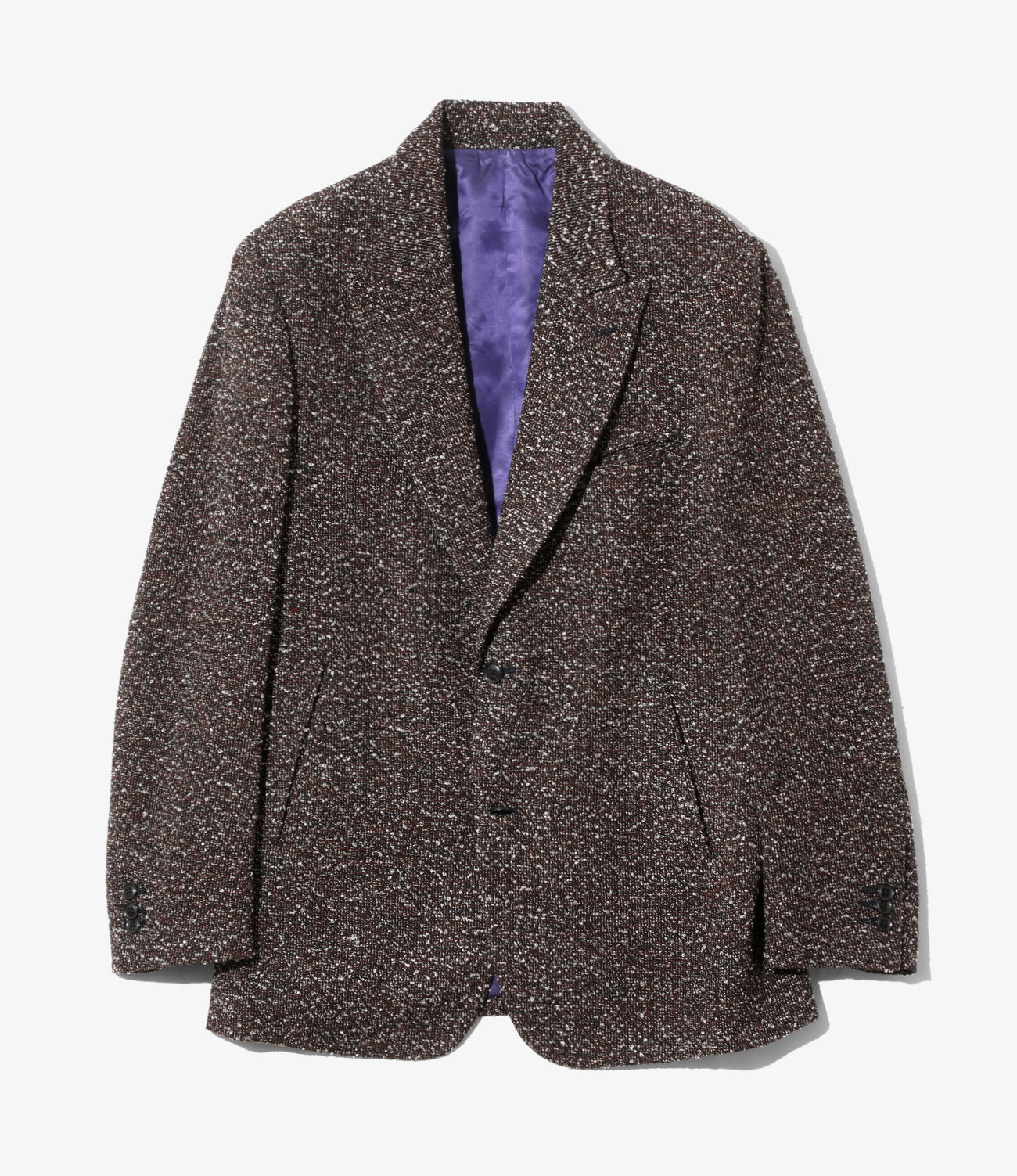 ワイドなピークドラペルが特徴的な2ボタンジャケット。さりげなく斜めにセットされた切り込みポケットが、シンプルなデザインを強調する〈NEEDLES〉らしいデザインとなっています。