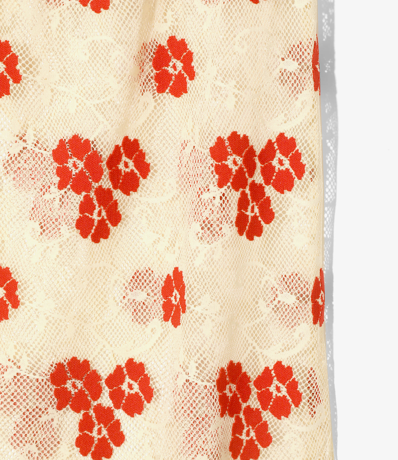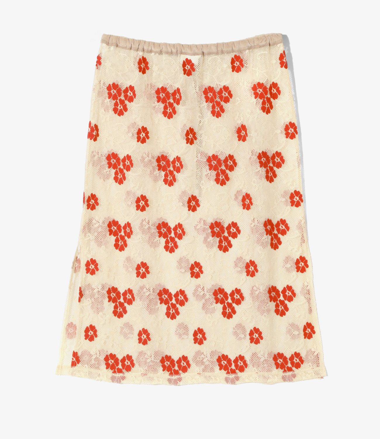 <RHODOLIRION>オリジナルの刺繍風の花柄レース生地を使用したミディアムレングスのペンシルスカートです。ストレッチが効き、ポリエステル100%のイージーケアです。両サイドスリットなので足さばきも軽快です。清涼感があり肌触りもさらりとしているので様々なレイヤリングのアクセントに。レース生地から覗くカラーコーディネイトも楽しめます。3本針の振りの効いた縫製は男っぽさもあります。シリーズはポロシャツ、ボレロ、パンツと全4アイテムです。
