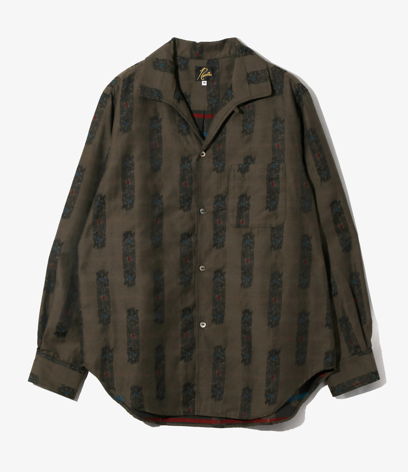 独特の襟型に涼し気な首周りのデザインがユニークな開襟シャツ。ジャガード織りで制作された生地は、プリントでは出せない立体感や奥行きがあり、高級感を感じます。