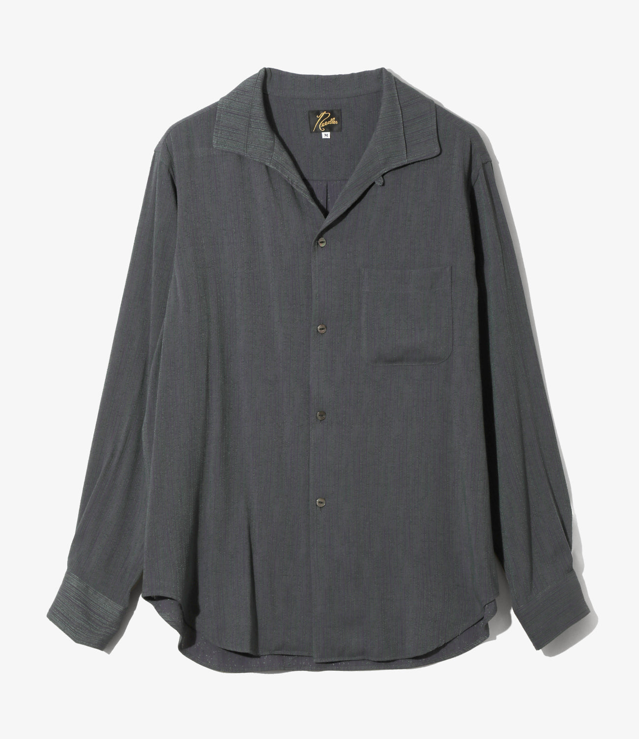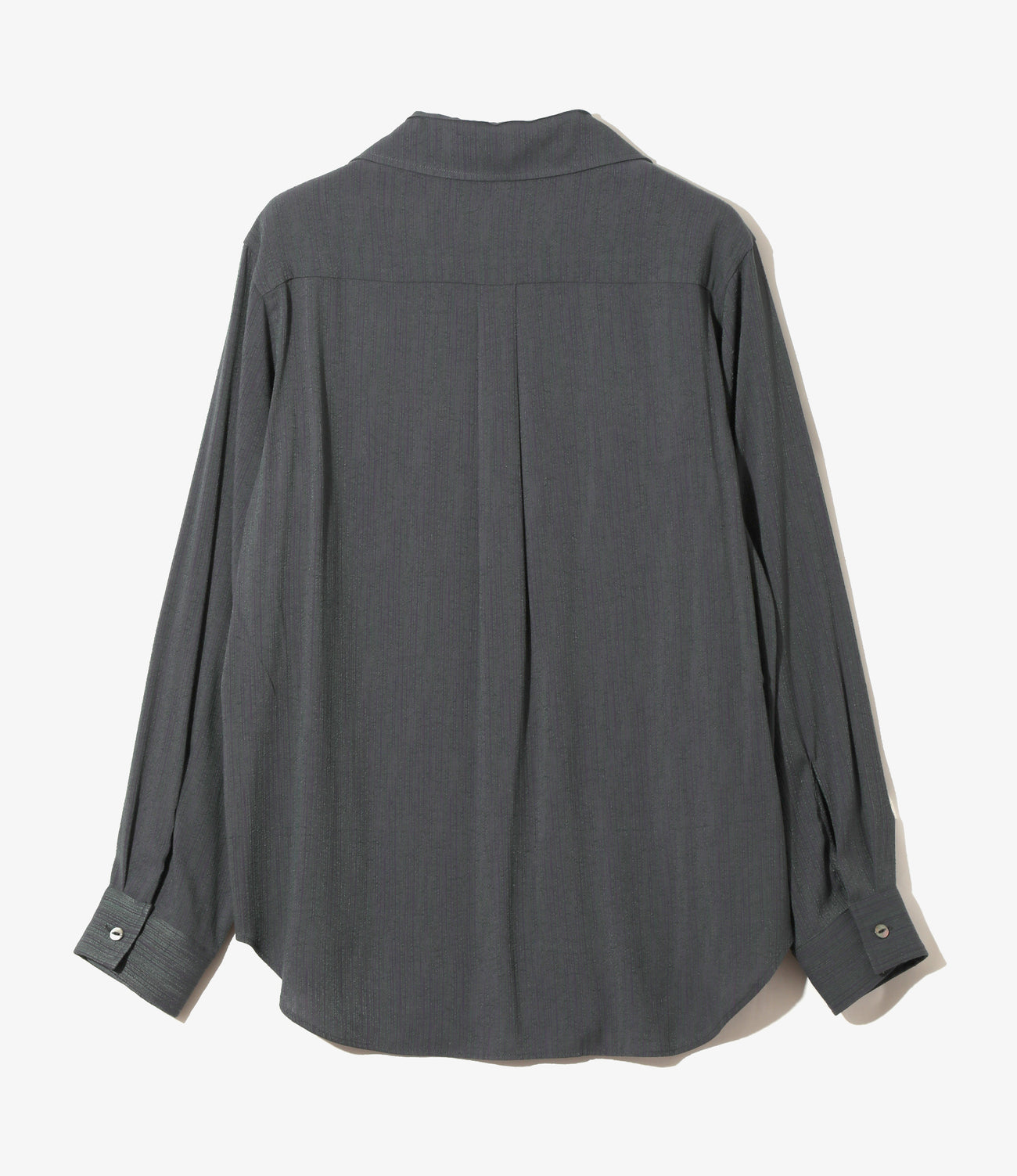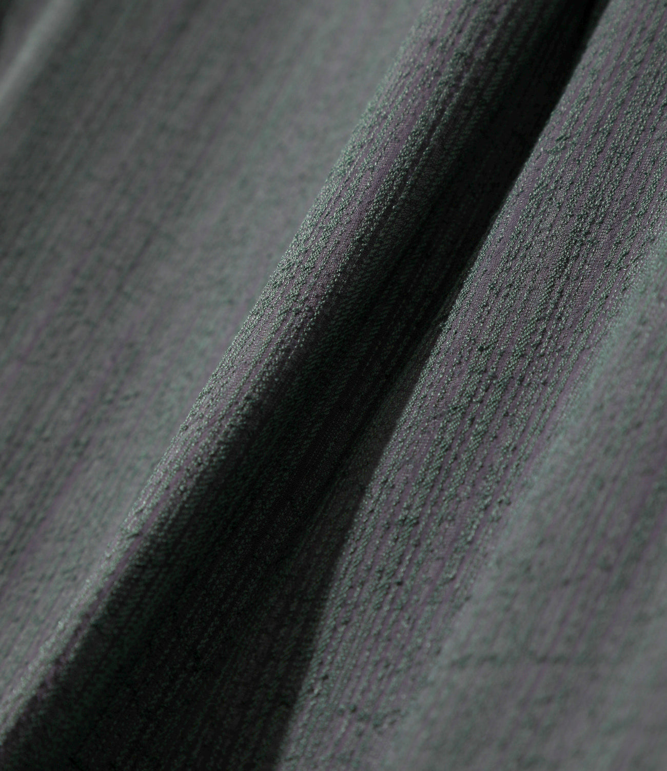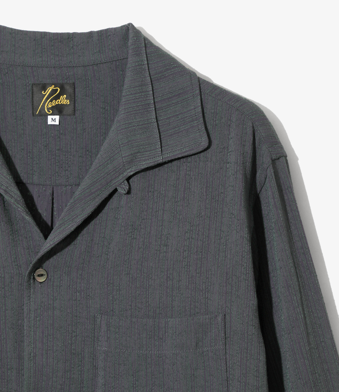 独特の襟型に涼し気な首周りのデザインがユニークな開襟シャツ。しわ感と落ち感のあるクレープ生地にストライプ柄を組み合わせた、柔らかく軽やかな一着です。
