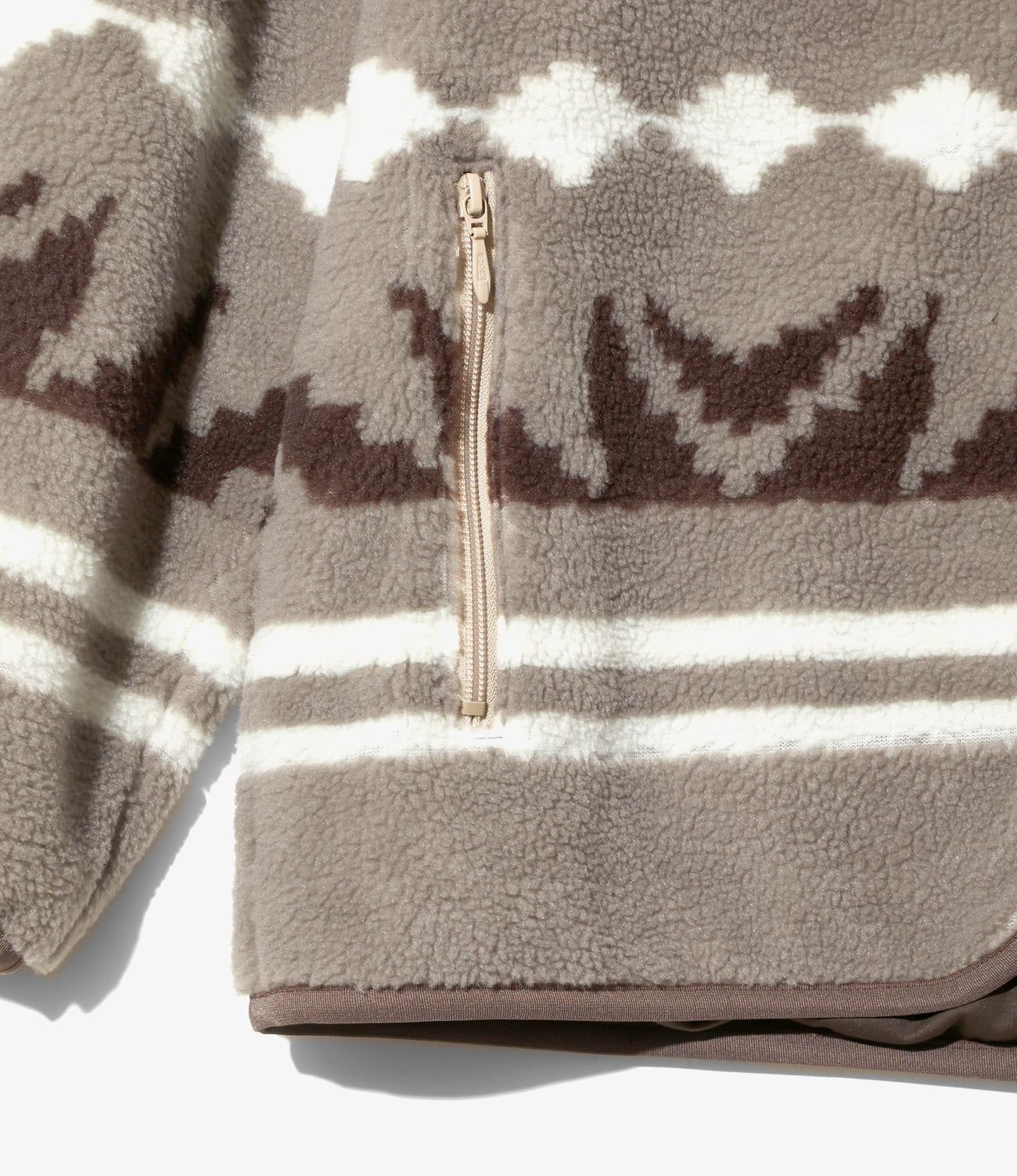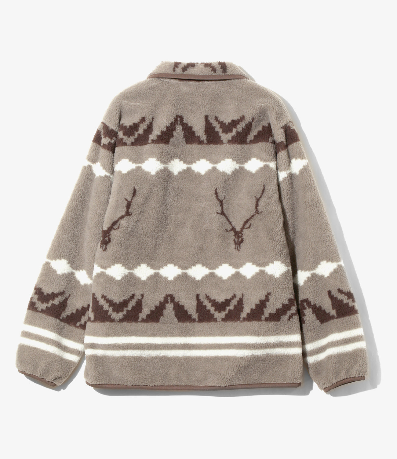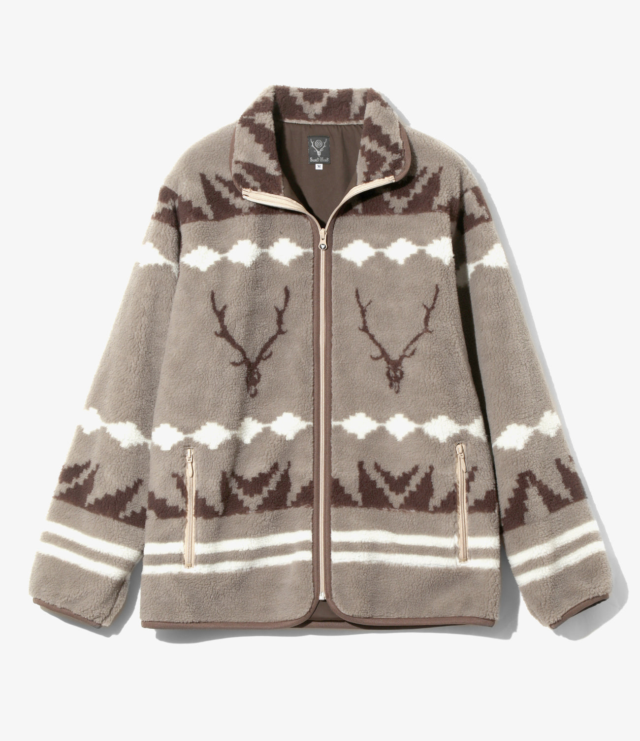 滑らかな手触りのポリエステルボア素材を使用したジップアップジャケット。ネイティブ柄やスカルが〈SOUTH2 WEST8〉らしいデザイン。保温性も抜群で速乾性にも優れているため、デイリーに活躍する一着となっています。