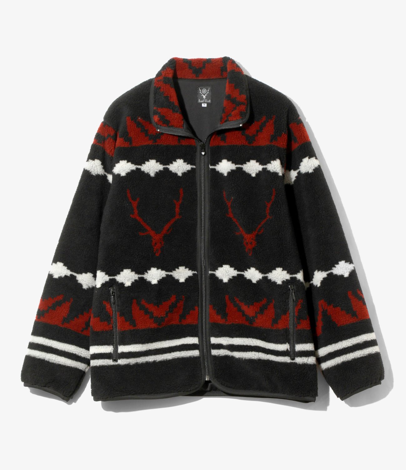 滑らかな手触りのポリエステルボア素材を使用したジップアップジャケット。ネイティブ柄やスカルが〈SOUTH2 WEST8〉らしいデザイン。保温性も抜群で速乾性にも優れているため、デイリーに活躍する一着となっています。