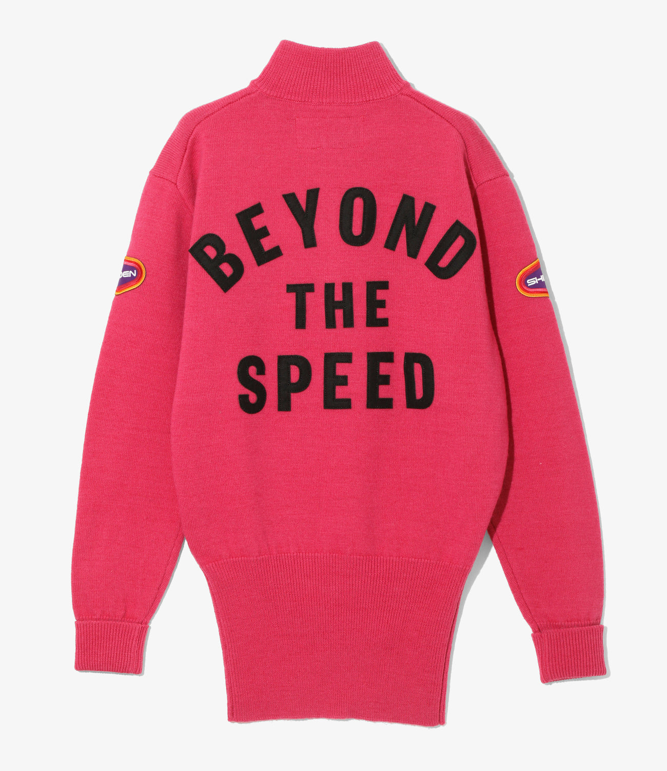 モータースポーツカルチャーから着想を得た〈SHIDEN〉のレーシングセーター。フロントに大胆に配されたブランドロゴと、両袖のワッペンディテールが印象的な一着です。ウール100%のしっかりと厚みのあるニット素材を使用、ハーフジップを開けると襟のようなデザインに変化し、コーディネートの幅も広がります。程よくゆとりのあるシルエットと長めのリブが、スポーティで立体的なフォルムを演出します。