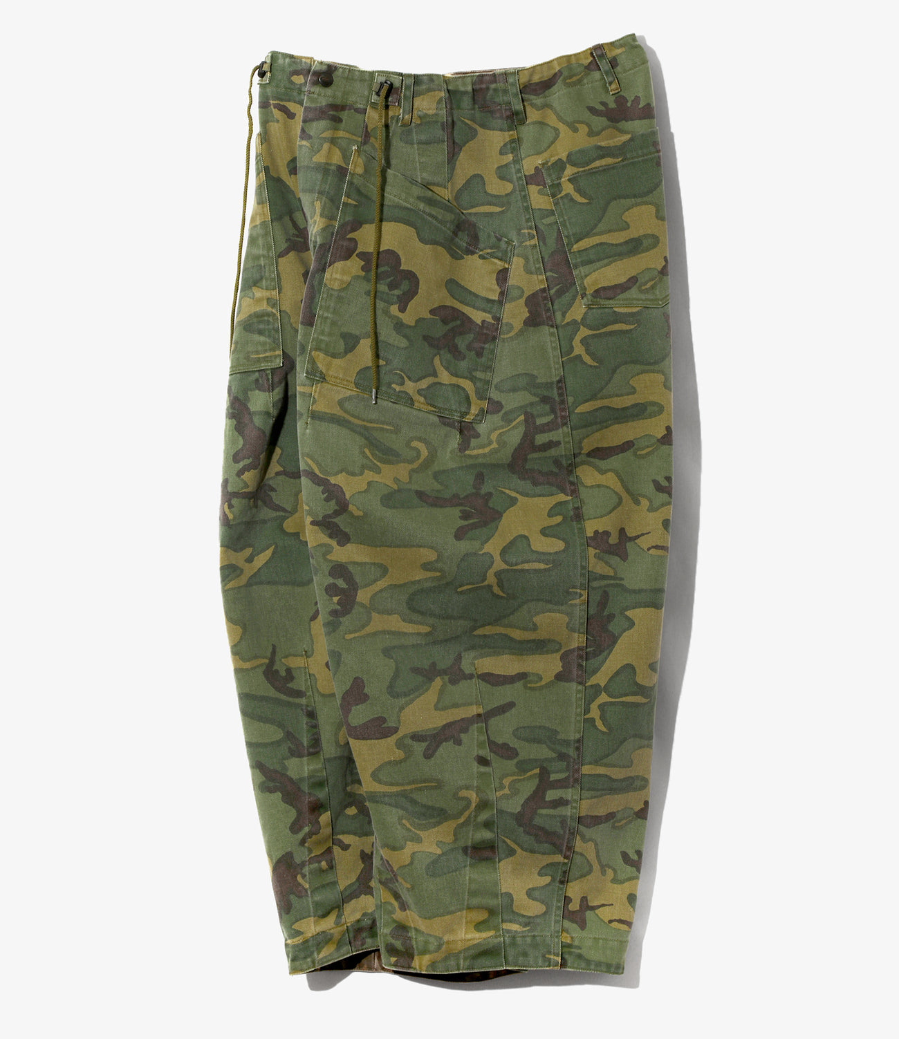 ウエストと裾のダーツ処理によってフロントが大きく膨らんだ、独特のシルエットが魅力の人気アイテムH.D. PANT。リラックス感のあるシルエットと、開放感のあるストレスのない履き心地も魅力です。表面はグリーン、裏面はブラウンのカモフラージュ柄はリバーシブルになっており、スタイリングに合わせて使い分けが可能です。二重のツイル素材は非常にタフで、デイリーに頼れる一本に仕上がっています。