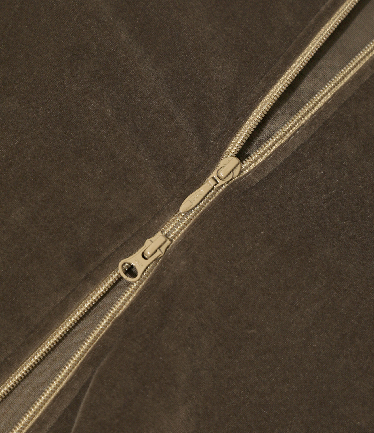 定番のポリエステルジャージー素材と並んで人気の高い、ベロア素材を使用したリブカラートラックジャケット。ソフトな発色と艶感のあるベロア特有のラグジュアリーな雰囲気が特徴的な一着です。首元はリブカラー仕様となっており、すっきりとしたスタイリッシュなイメージが強調されています。今シーズンはスチールブルー、トープ、ブラウンの3色でリリースです。