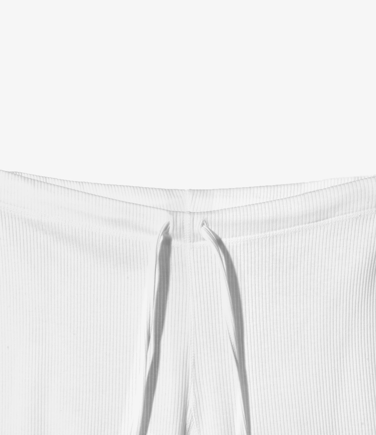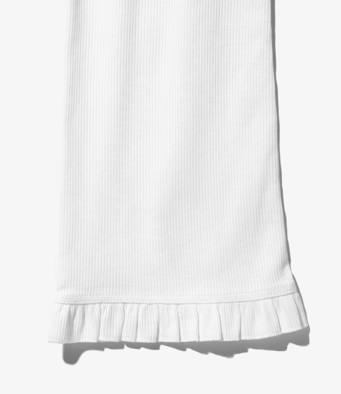 適度な肉感とストレッチ性、すっきりとした表情が特徴のテレコ素材をベースに、裾口にフリルが施されたセミフレアシルエットのイージーパンツです。股マチには別地のフライス素材で切り替えられており、全体は3本針仕様なのでヴィンテージアンダーウエアを彷彿させます。スカートやワンピース下にレイヤリングアイテムとして大変重宝します。