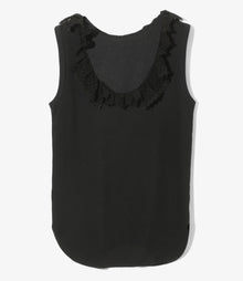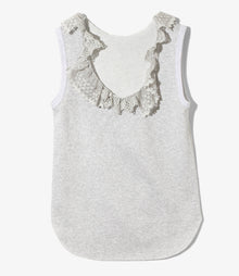 <RHODOLIRION>定番のリブシリーズに新しいモデルが登場。適度な肉感とストレッチ性、すっきりとした表情が特徴です。コットンレースがたっぷりトリミングされ、前後どちらでも着られる2Way仕様。深めのUネックでインナーのレイヤリングで表情を変えられます。シャツの襟元からレースを覗かせたり、アウターとしてベスト風に重ねてもOK。同素材のパンツとのスーチングスタイルもおすすめです。