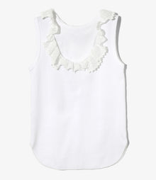 <RHODOLIRION>定番のリブシリーズに新しいモデルが登場。適度な肉感とストレッチ性、すっきりとした表情が特徴です。コットンレースがたっぷりトリミングされ、前後どちらでも着られる2Way仕様。深めのUネックでインナーのレイヤリングで表情を変えられます。シャツの襟元からレースを覗かせたり、アウターとしてベスト風に重ねてもOK。同素材のパンツとのスーチングスタイルもおすすめです。
