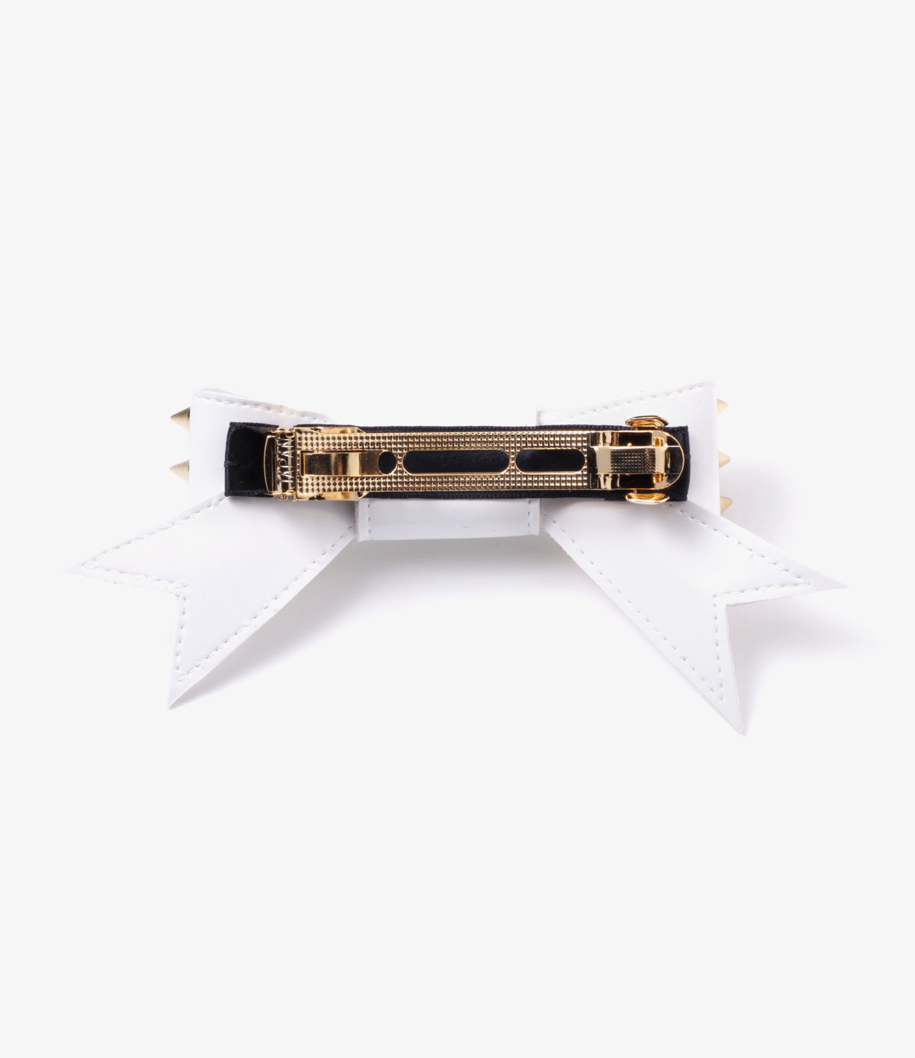 リボンモチーフアクセサリーの新シリーズが登場。大ぶりなリボンモチーフにスタッズを配したバレッタ。リボンモチーフの愛らしさとスタッズのハードさが個性的な印象。カラーはホワイト、ブラック、シルバーの3色展開。シリーズはピアス、ブレスレットと3アイテム展開です。