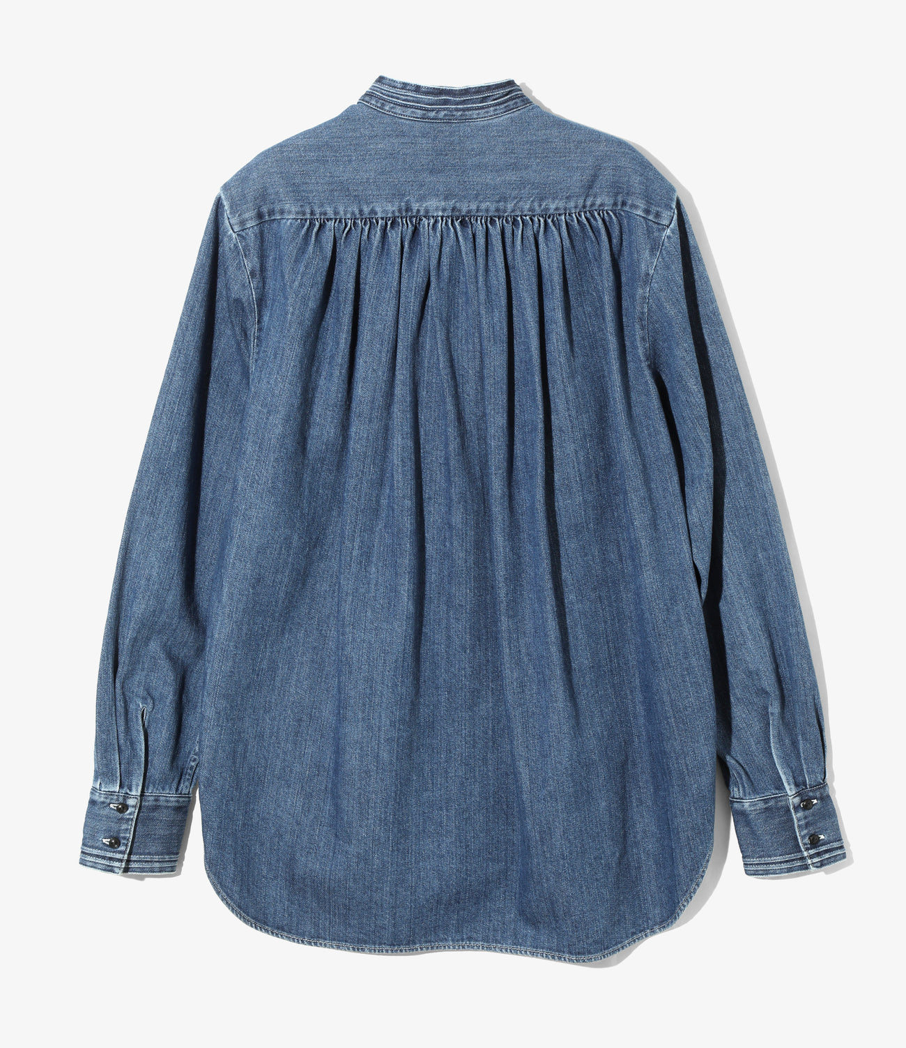 <RHODOLIRION>の定番、前身ごろに繊細なピンタックが施されたリボンブラウス。背面も首元から広がるギャザーをたっぷりと施しています。クラシカルなデザインに加え、デニムの野生的な雰囲気も楽しめます。8オンスクラスのデニム素材を使用し、ヴィンテージ加工で経年変化したようなしなやかさが魅力。上品さとカジュアルさが絶妙に調和した一着です。