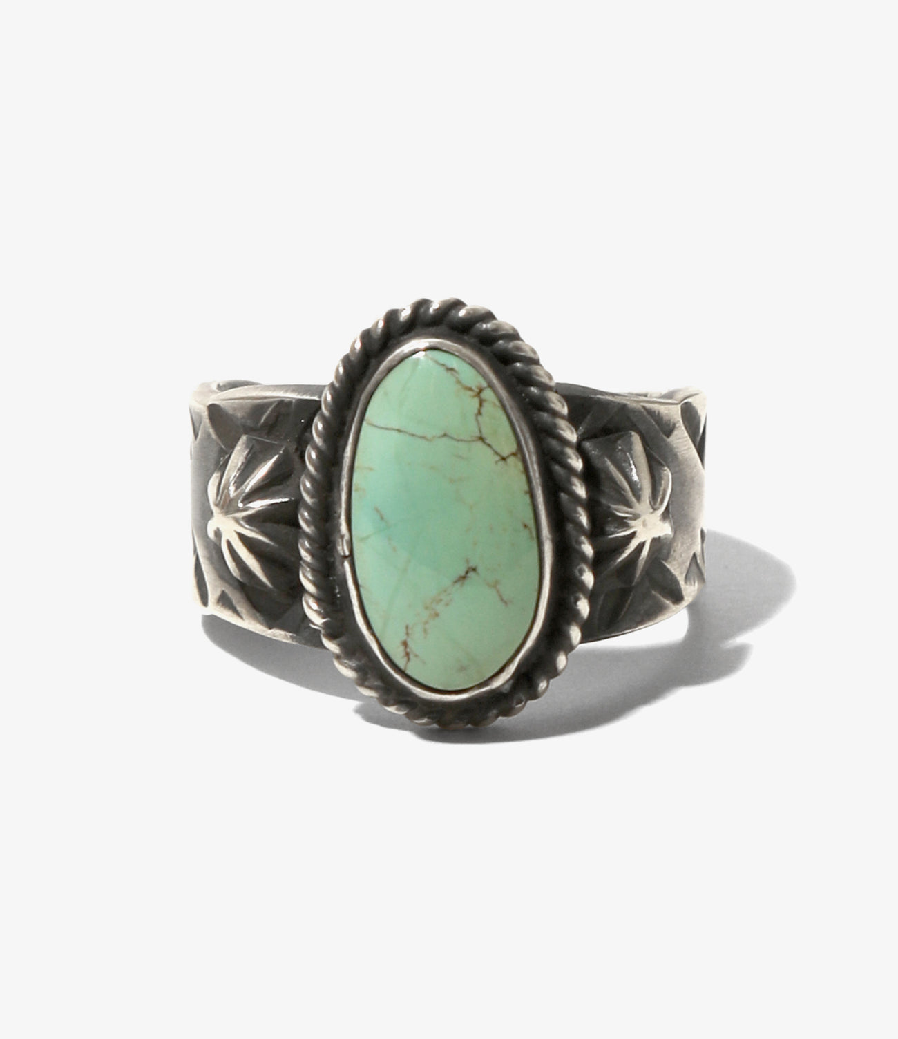 ナヴァホ族のアーティストKINSLEY NATONIによる作品。美しワイヤーワークによるフレームと、表情豊かなロイストンターコイズが特徴的なリングです。US8(日本サイズ17.5号)となります。