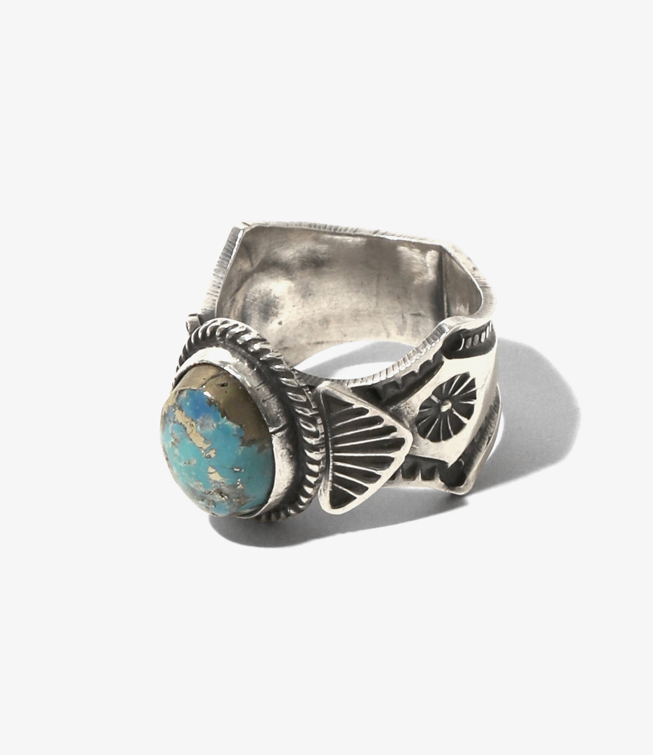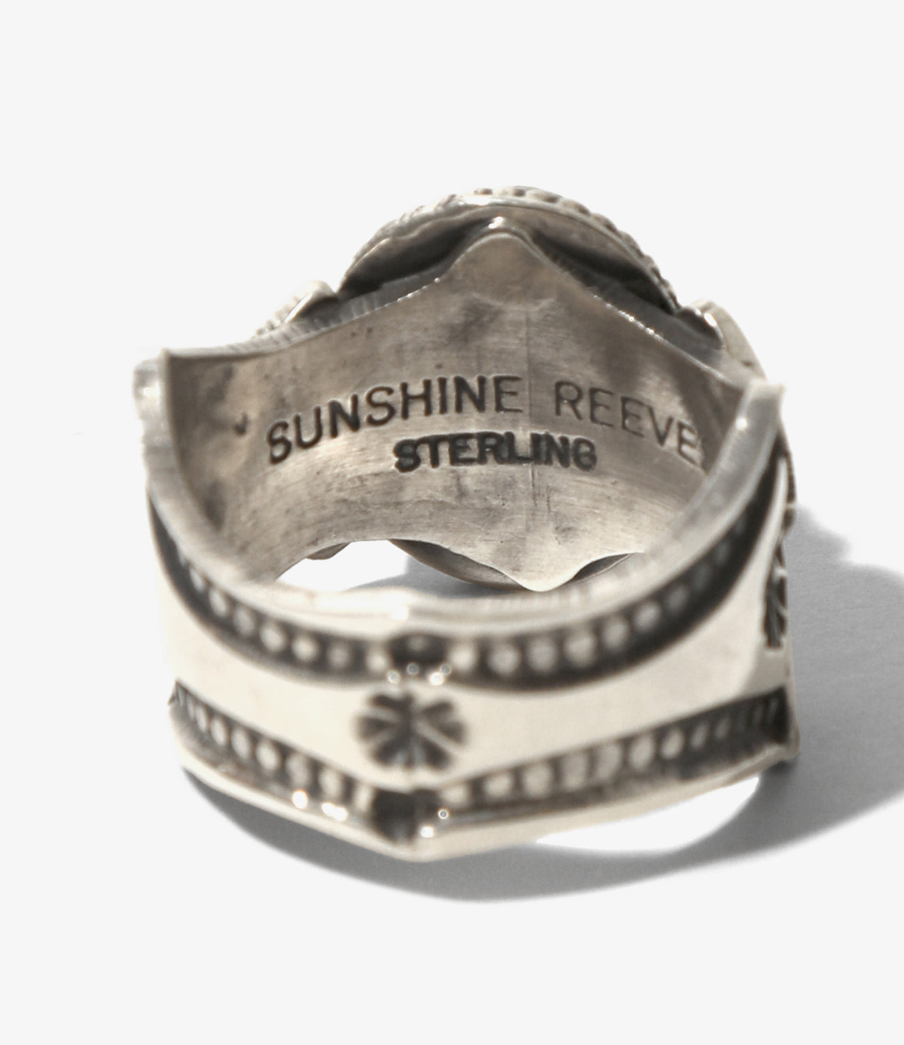 ナヴァホのシルバースミス、SUNSHINE REEVESによる作品。スタンプワークとペルシアンターコイズを組み合わせたリングです。ボリューム感のある存在感抜群の逸品となっています。US8(日本サイズ17.5号)となります。