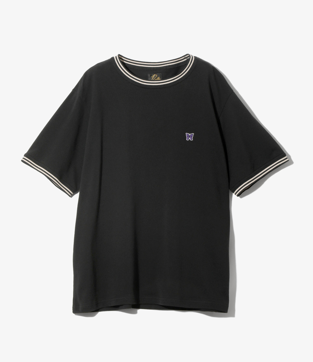 首回りや袖口にボディと色違いの生地をパイピングした、シンプルなリンガーTシャツが登場です。ややゆとりのあるシルエットに、左胸には蝶の刺繍が施されています。ポロシャツでは定番となっているコットンピケ素材を採用しており、さらりとしたドライな着心地となっています。