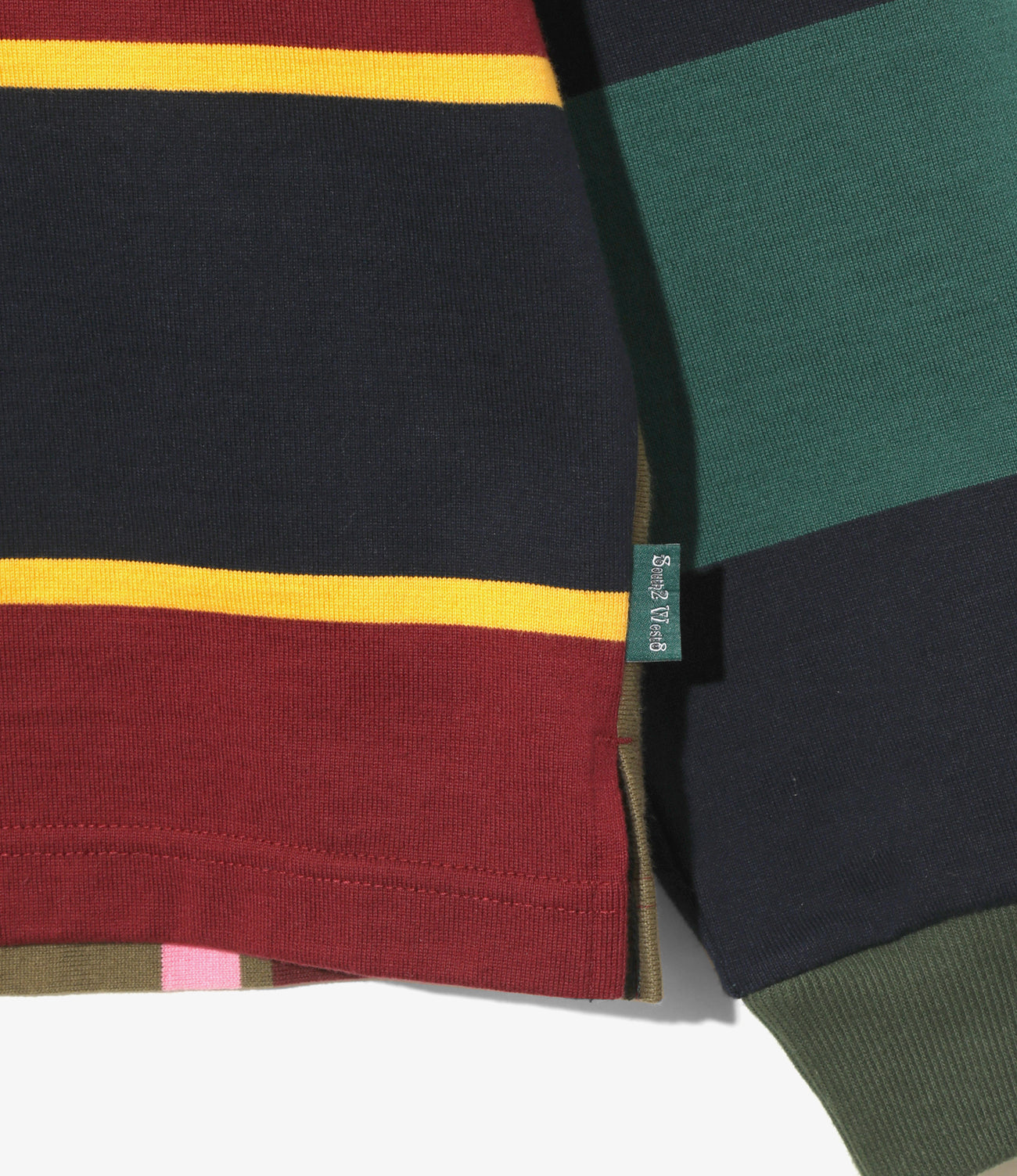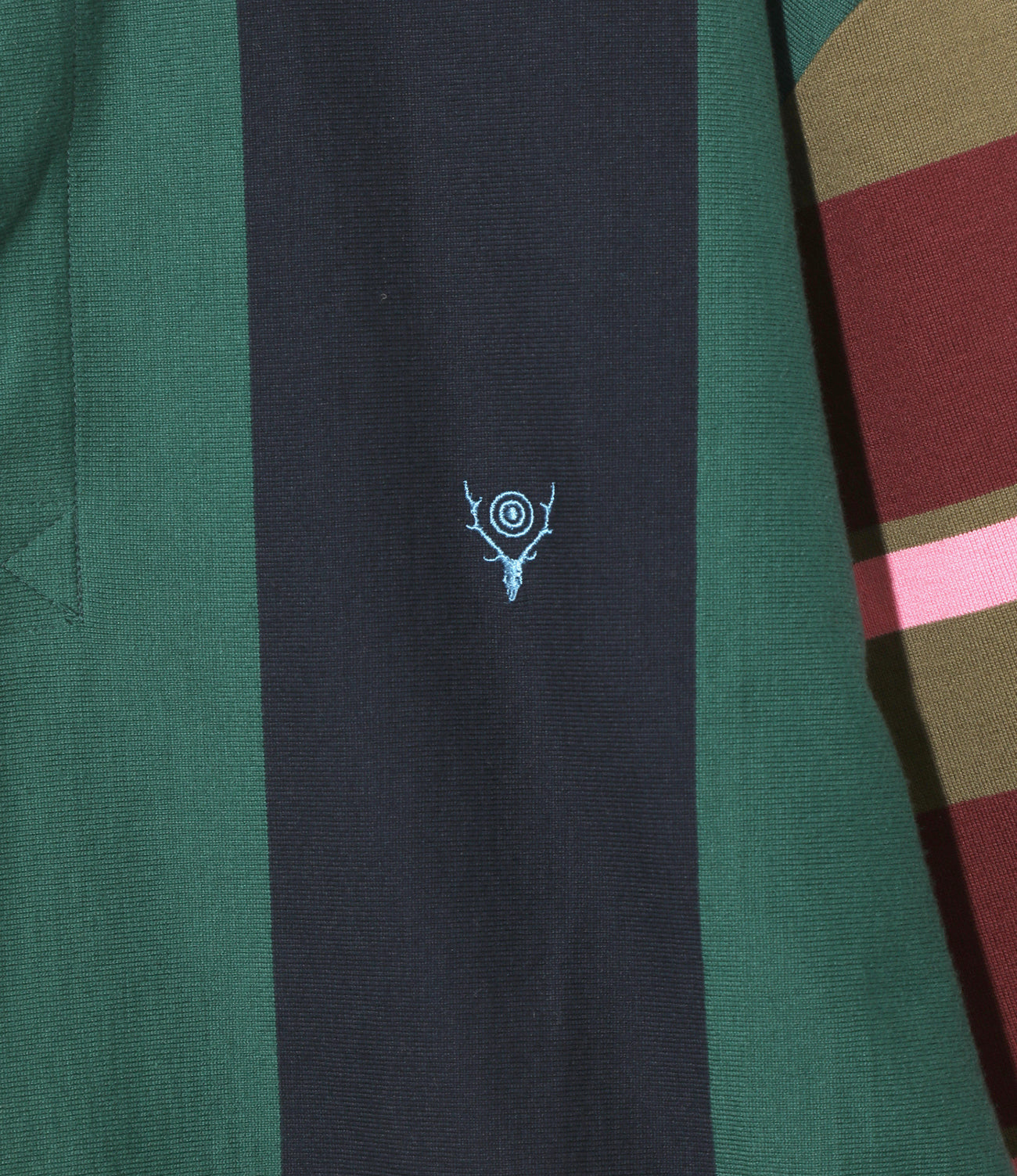 〈SOUTH2 WEST8〉からユニークなラガーシャツが登場しました。本格的なファブリックは糸からオリジナルで制作、ラバーボタンを採用するなどオーセンティックな雰囲気をしっかりと感じられる一着に仕上がりました。またクレイジーパターンで組み立てられたデザインは、唯一無二の個性的なルックスが魅力です。