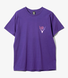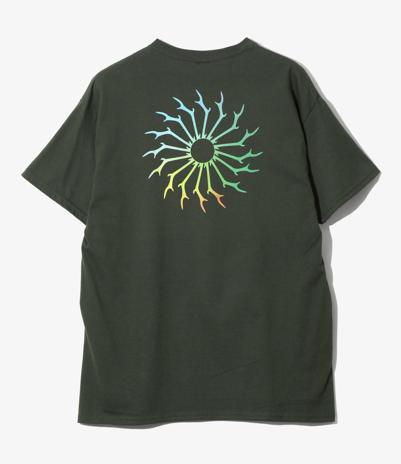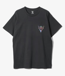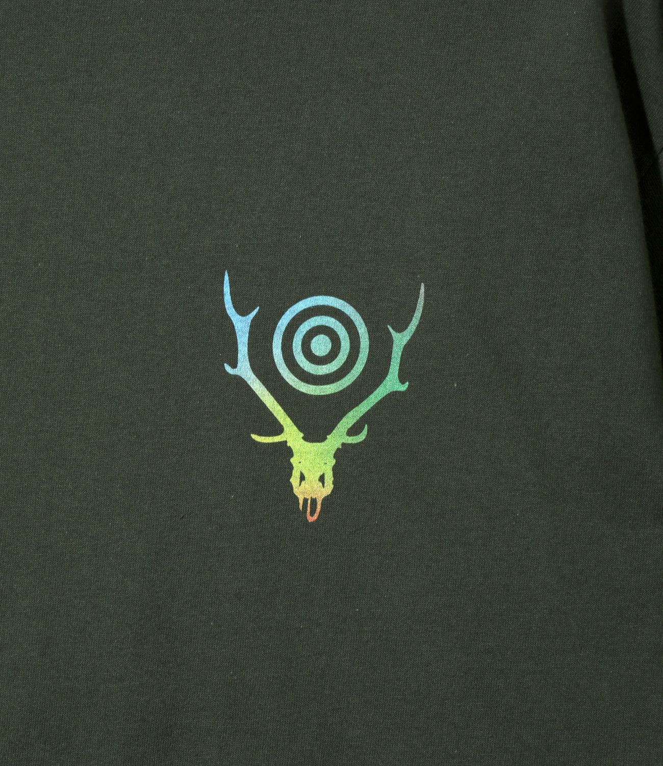 シンプルなボディに印象的なプリントをあしらった、〈SOUTH2 WEST8〉定番のTシャツが登場。フロント左胸にはディアスカルとターゲットマークのアイコンが、バックには大胆にサークルホーンのプリントが施されています。よりアクティブな着こなしやレイヤードスタイルにもフィットする一枚です。