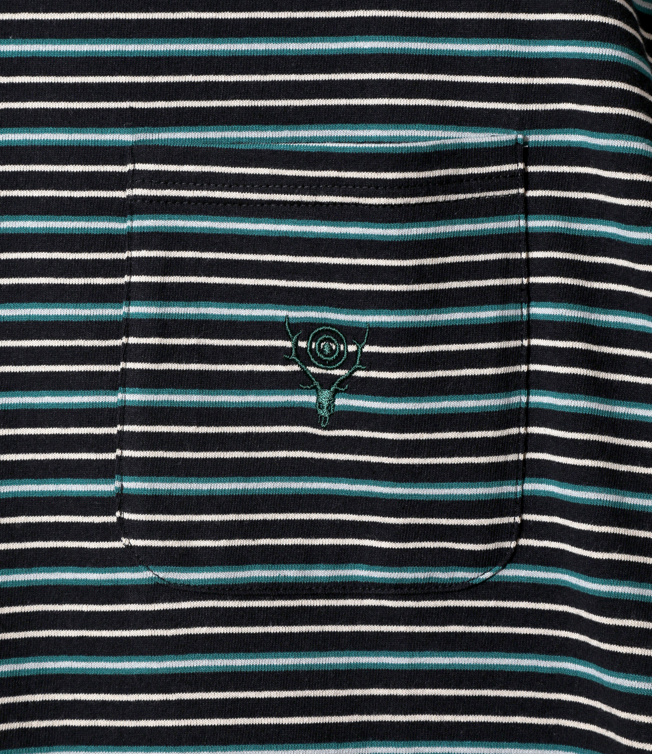 シンプルなデザインながら、さりげなく個性を主張するポケットTシャツ。胸ポケットには、ブランドを象徴するSkull&Targetの刺繍が控えめに施してあり、細いピッチと独特なカラーリングが、ベーシックながらも目を引く一着です。