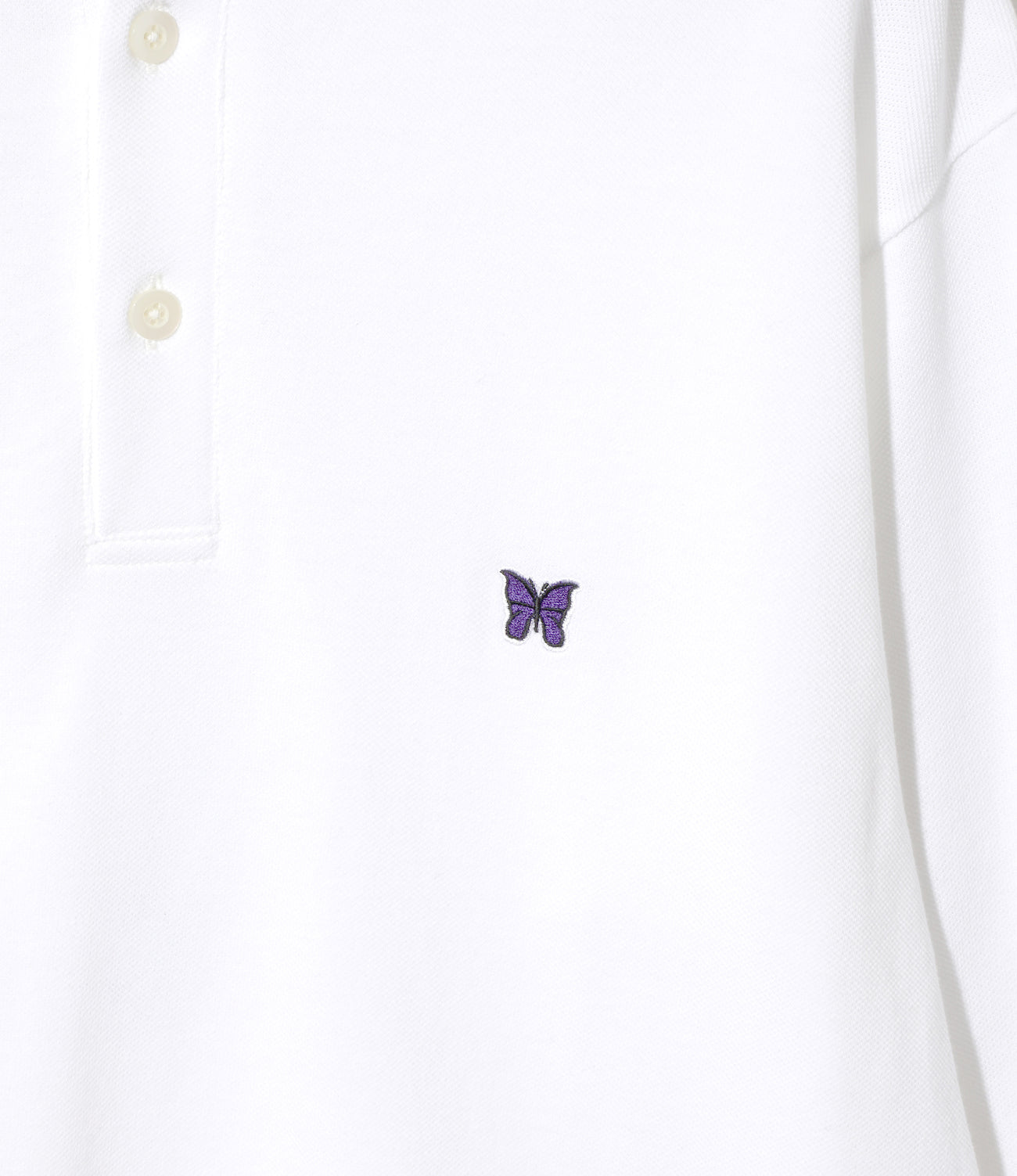 襟がショールカラーのデザインにアレンジされたユニークなポロシャツ。左胸には蝶の刺繍が施されています。ポロシャツでは定番となっているコットンピケ素材を採用しており、さらりとしたドライな着心地となっています。シルエットは適度にゆとりのあるフィット感です。