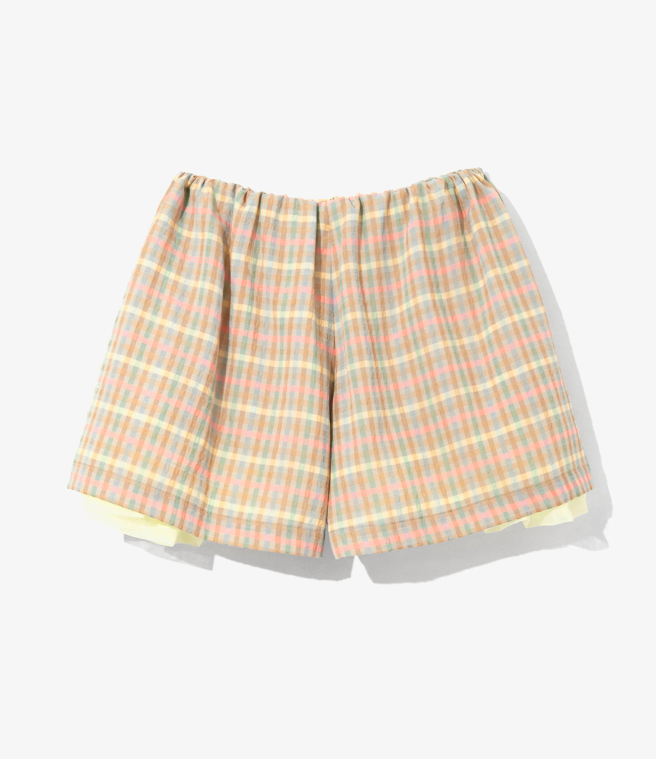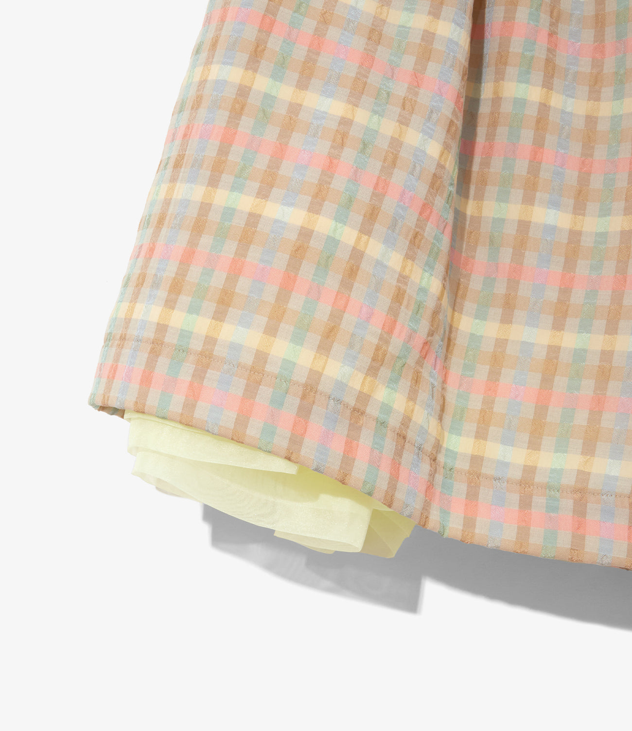 やさしい配色のチェック柄とシアー感のある素材が目を惹くショートパンツが今季登場しました。オーガンジーのライニングを重ねることで、ほどよいボリュームと美しいドレープを生み出し、華やかな印象に仕上げています。