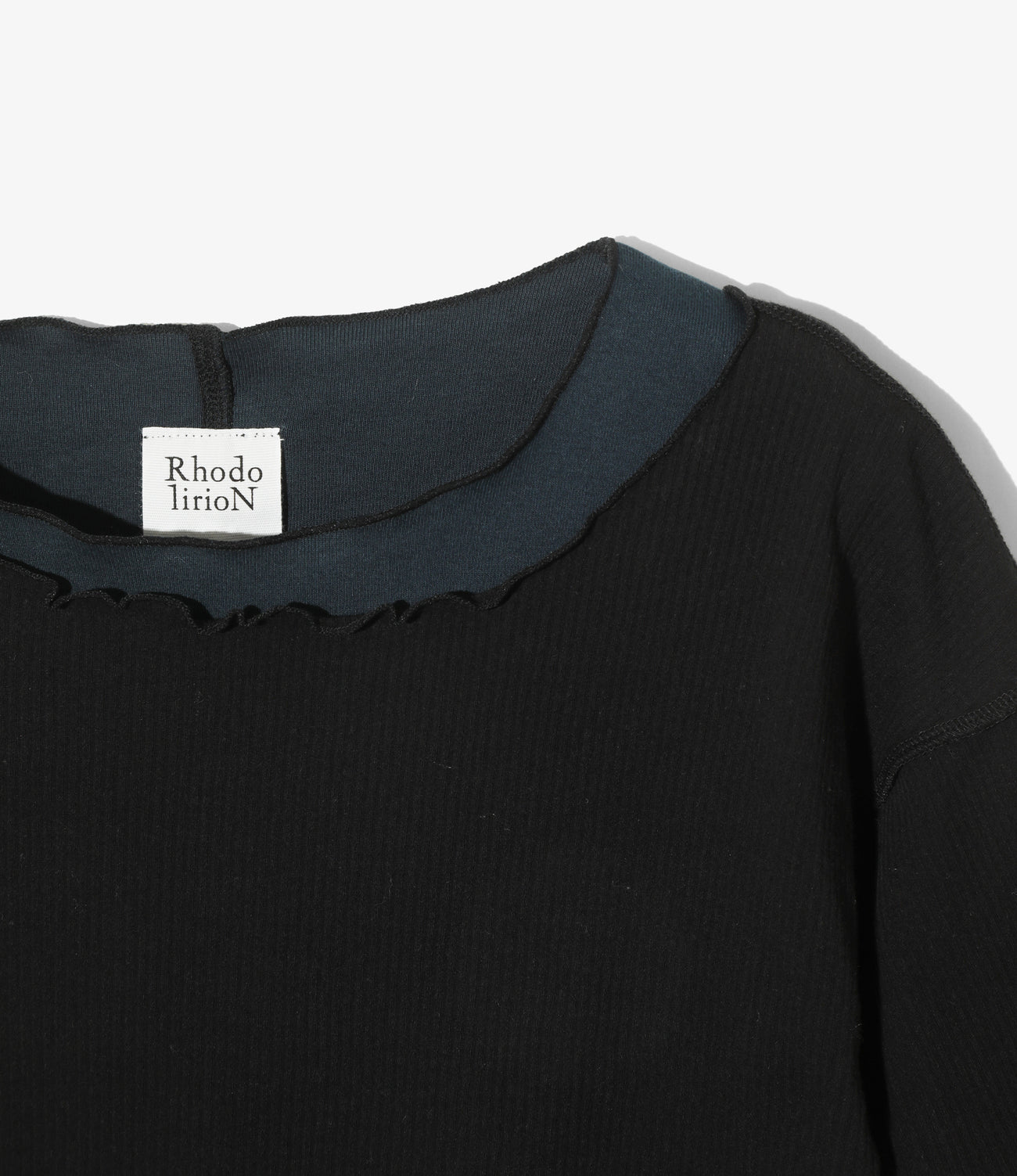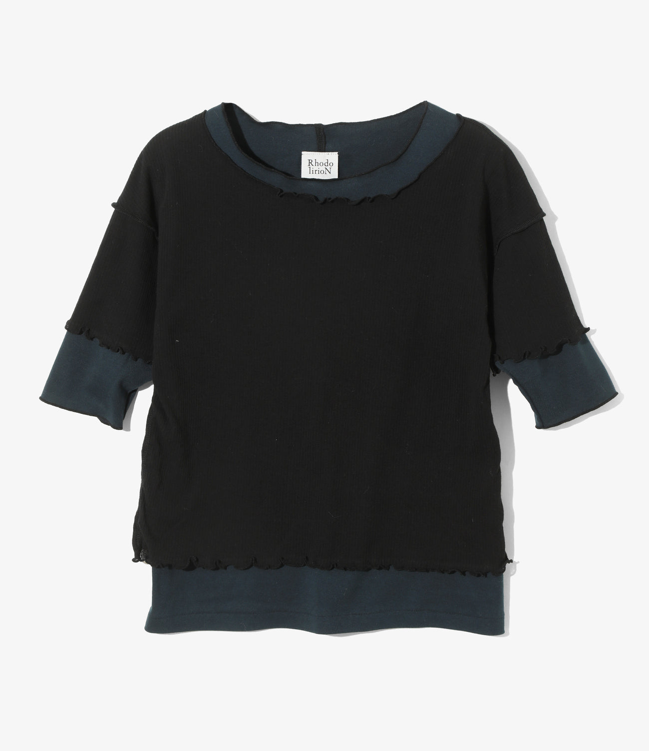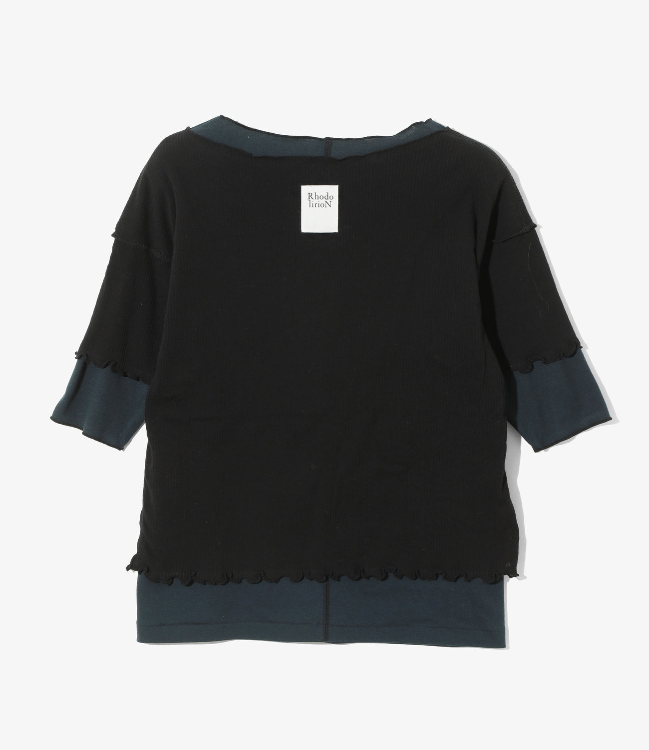 タンクトップとロングスリーブTがセットになったユニットトップス。ロングスリーブTは透け感のある強撚ドライタッチの糸を使い、ランダムな針抜きリブで仕上げました。タンクトップはふっくら柔らかいフライス地で、横伸縮性に優れています。ロングスリーブTは、3本針でヨーク切り替えやパッチワーク風のデザイン、袖口と襟ぐりにレタスエッジを施し、さりげないアクセント。タンクトップはバインダー襟で男っぽく、前後どちらでも着用可能。内・外どちらでもレイヤードできる万能トップスです。