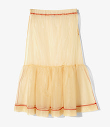 光を集めるようなたっぷりの光沢感が美しい、エアリーなトリコット素材のティアードスカートです。通気性がよく、伸縮性にも優れているので様々なアイテムとのレイヤリングも楽しめます。また、シワもつきにくく、形も崩れにくい特徴もあります。3本針の振りで配色もさりげなく、ティアードのタックギャザーも傾斜をランダムにつける事によって表情が豊かに再現されています。レイヤリングしたボトムスのポケットに手が入れられるようにスカートにはポケットスリットだけ採用しています。