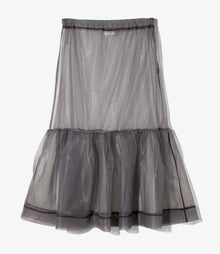 光を集めるようなたっぷりの光沢感が美しい、エアリーなトリコット素材のティアードスカートです。通気性がよく、伸縮性にも優れているので様々なアイテムとのレイヤリングも楽しめます。また、シワもつきにくく、形も崩れにくい特徴もあります。3本針の振りで配色もさりげなく、ティアードのタックギャザーも傾斜をランダムにつける事によって表情が豊かに再現されています。レイヤリングしたボトムスのポケットに手が入れられるようにスカートにはポケットスリットだけ採用しています。