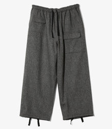 リラックス感のあるワイドシルエットに、ウエストとヘムのストリング仕様、アシンメトリックに配置されたパッチアンドフラップポケットが特徴的な一本。締め付けのないイージーな履き心地が魅力のバルーンパンツです。ウールネップは、繊維の一部が太くなったり絡まり合った部分が、表面に小さな膨らみを生むこと。このネップがあることでツイードの生地に独特のテクスチャーや深みが生まれ、よりクラシックな雰囲気に仕上がりました。