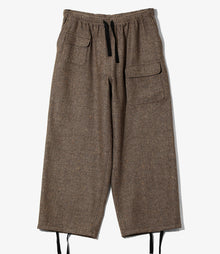 リラックス感のあるワイドシルエットに、ウエストとヘムのストリング仕様、アシンメトリックに配置されたパッチアンドフラップポケットが特徴的な一本。締め付けのないイージーな履き心地が魅力のバルーンパンツです。ウールネップは、繊維の一部が太くなったり絡まり合った部分が、表面に小さな膨らみを生むこと。このネップがあることでツイードの生地に独特のテクスチャーや深みが生まれ、よりクラシックな雰囲気に仕上がりました。