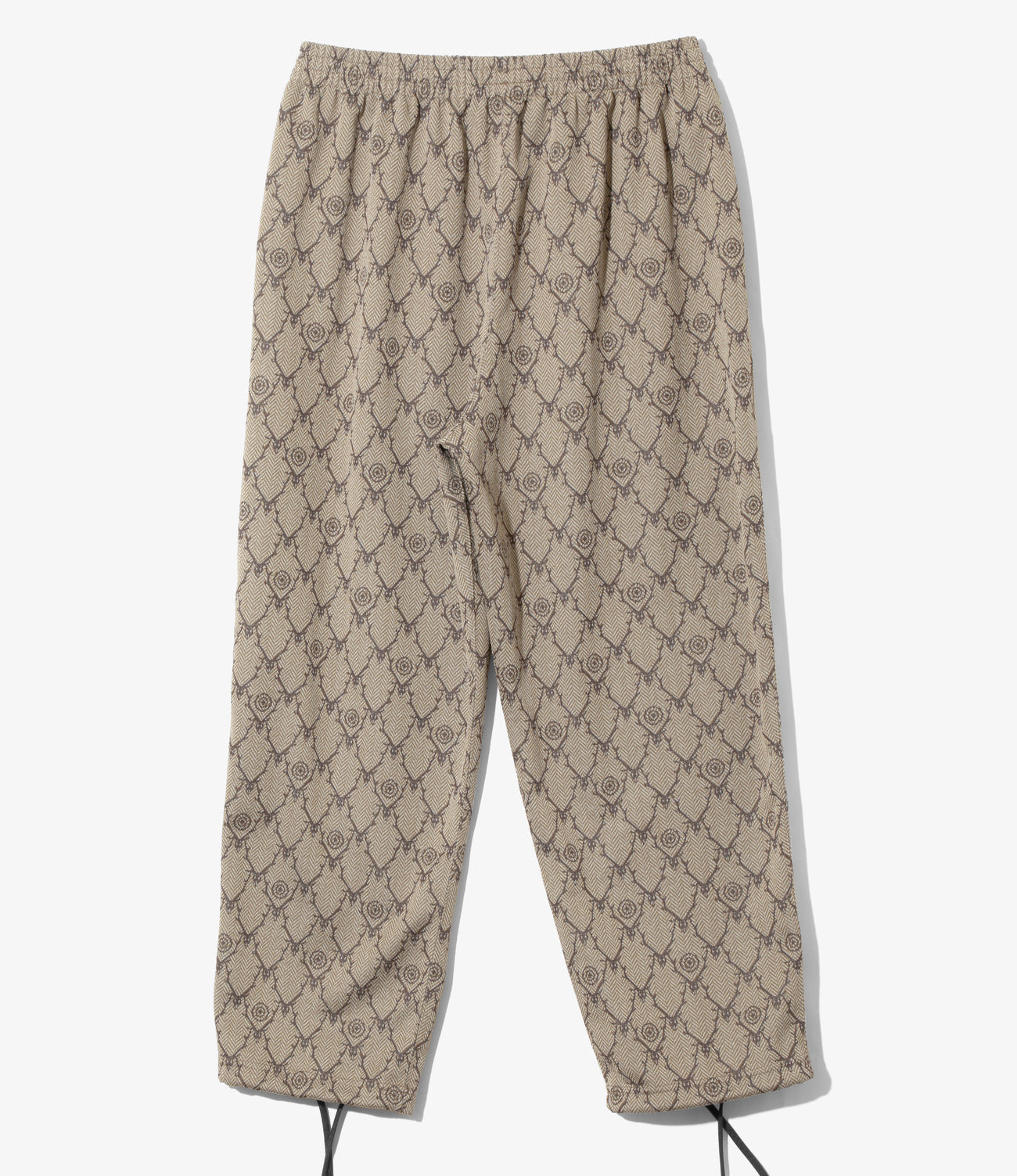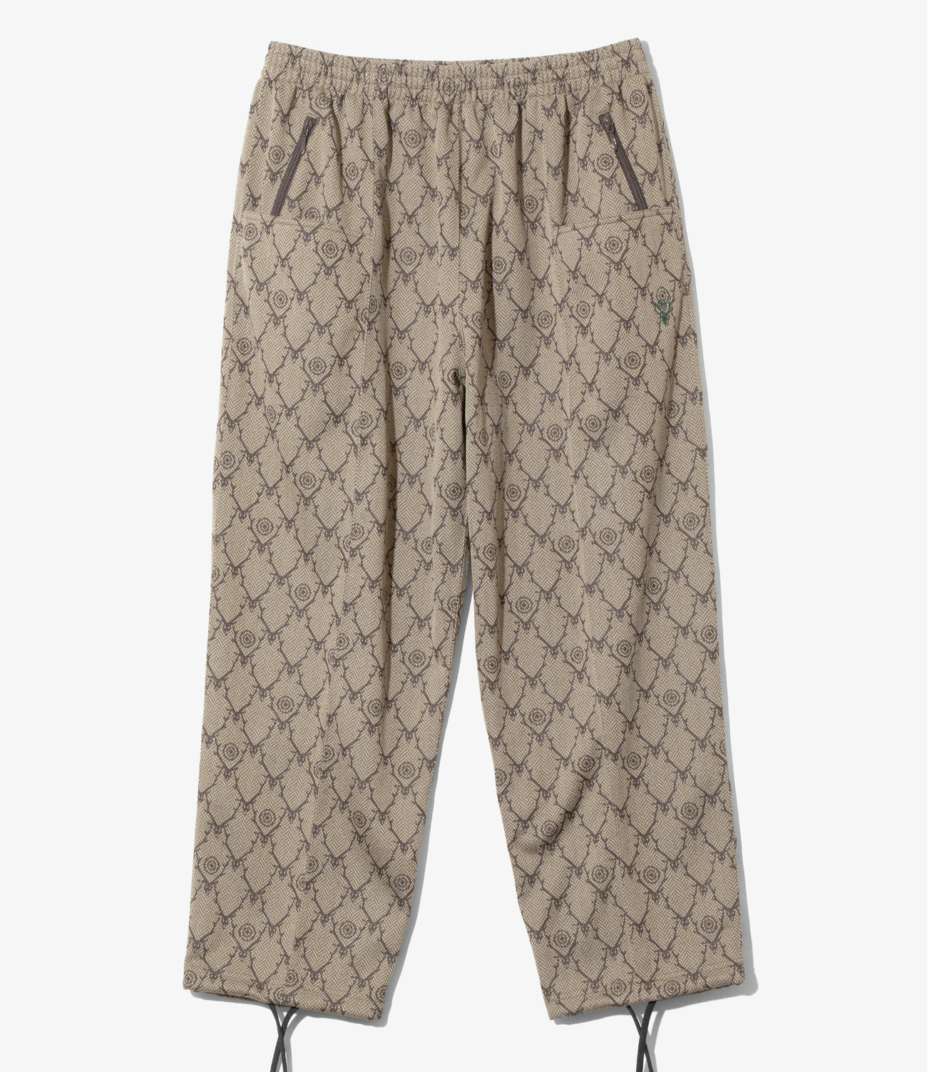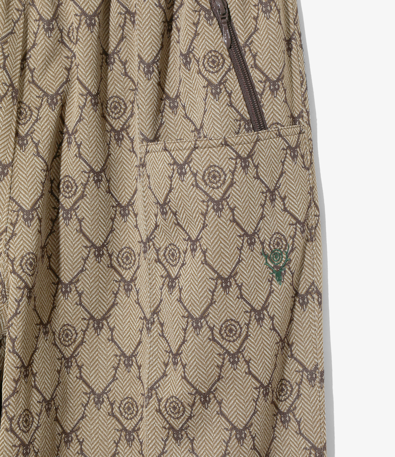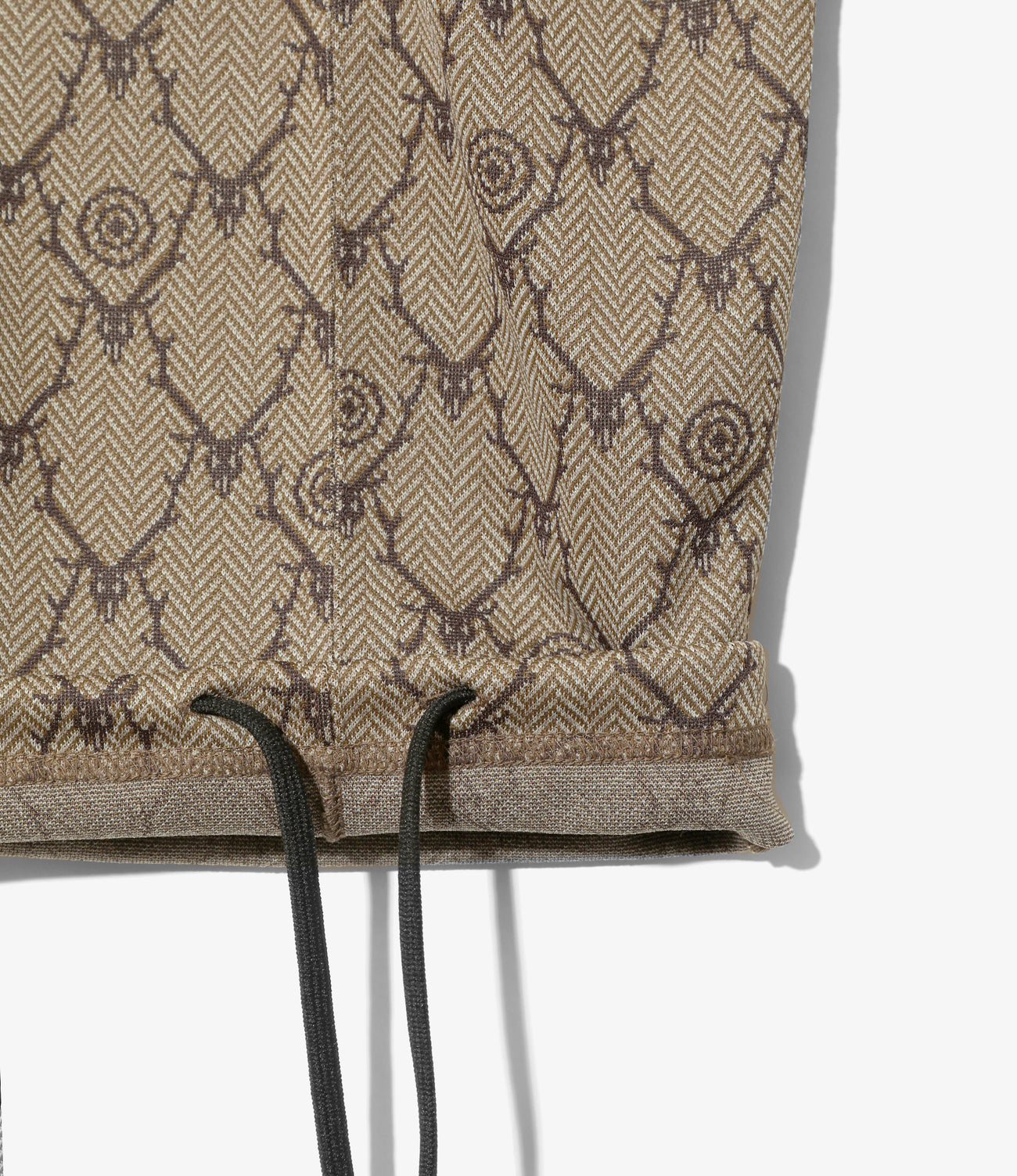 リラックス感のあるワイドシルエットが特徴的な定番のセンターシームパンツを、スカル&ターゲット柄のジャカード素材で制作。ウエストはドローコードのイージーな仕様です。両脚のセンターシーム、2つ重なるように取り付けられたサイドポケットなど、印象的なディテールを多数備えています。裾にはドローコードも備えており、シルエットをアレンジした着こなしも可能です。同素材でジャケットとクルーネックシャツが展開され、セットアップでもお楽しみ頂けます。