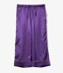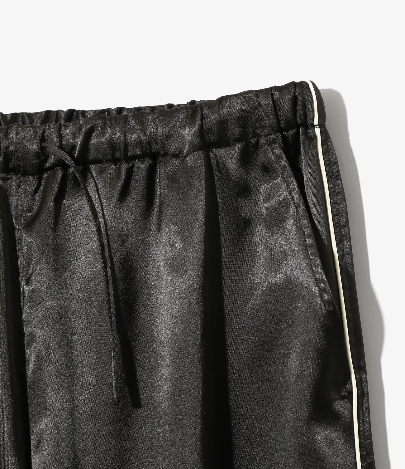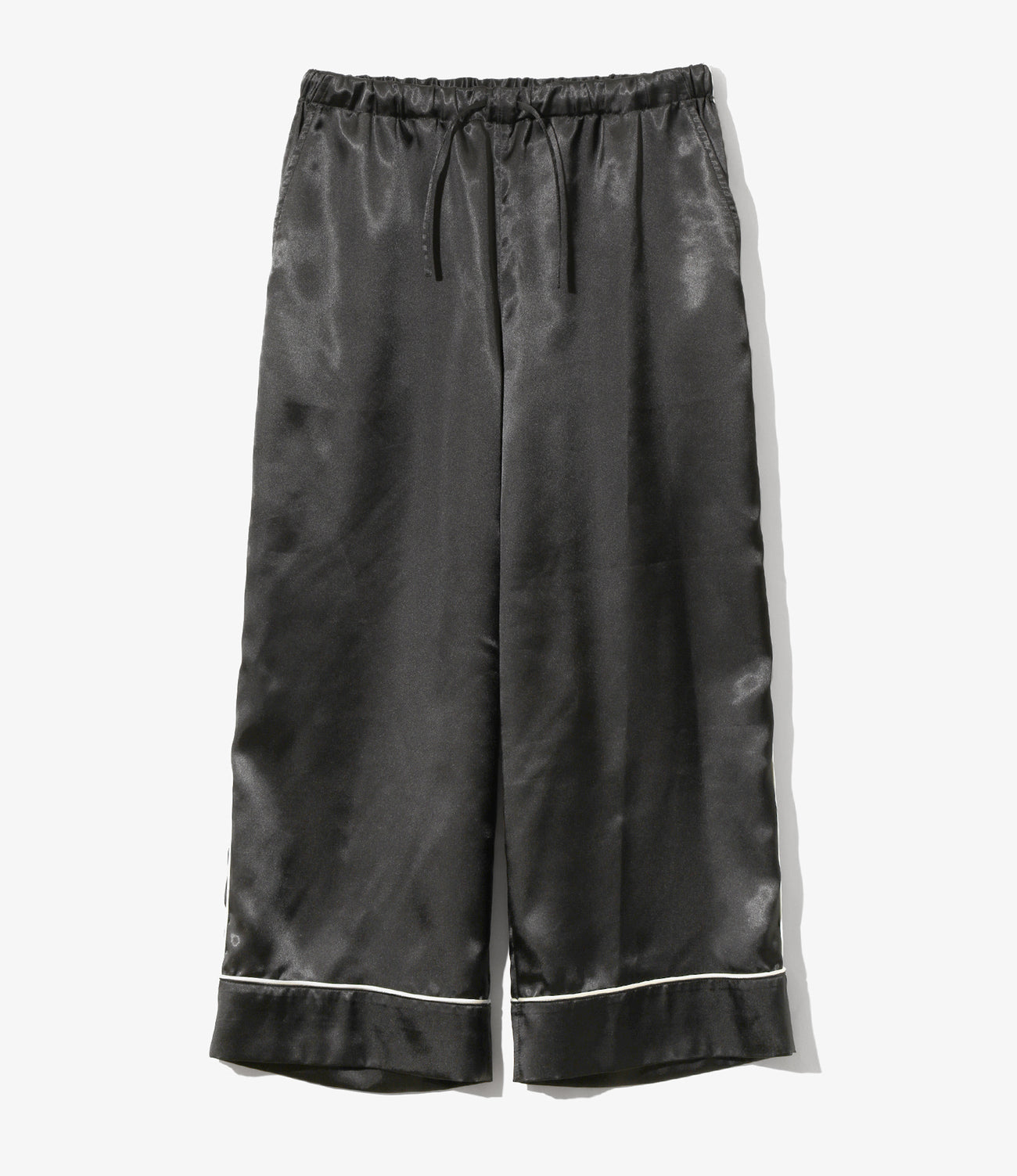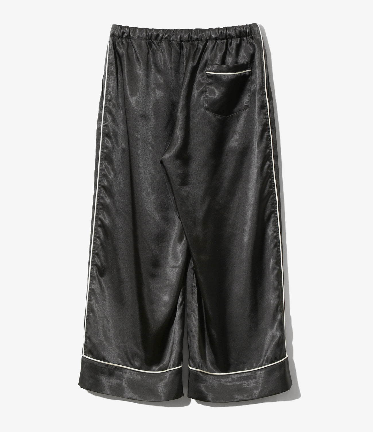 ストリングウエストのイージーパンツ。シンプルな作りながらもゆとりのあるワイドシルエットと、随所に施されたパイピングが立体感を演出。なめらかな質感と光沢が美しいポリエステルサテン素材を採用し、上品なリラックスムードを感じる一着に仕上がっています。同素材でブラウスも展開しており、セットアップでの着用もオススメです。