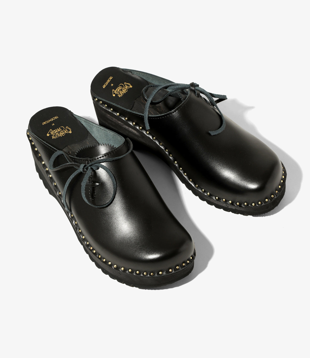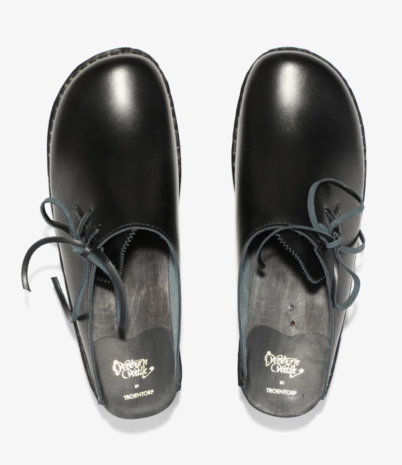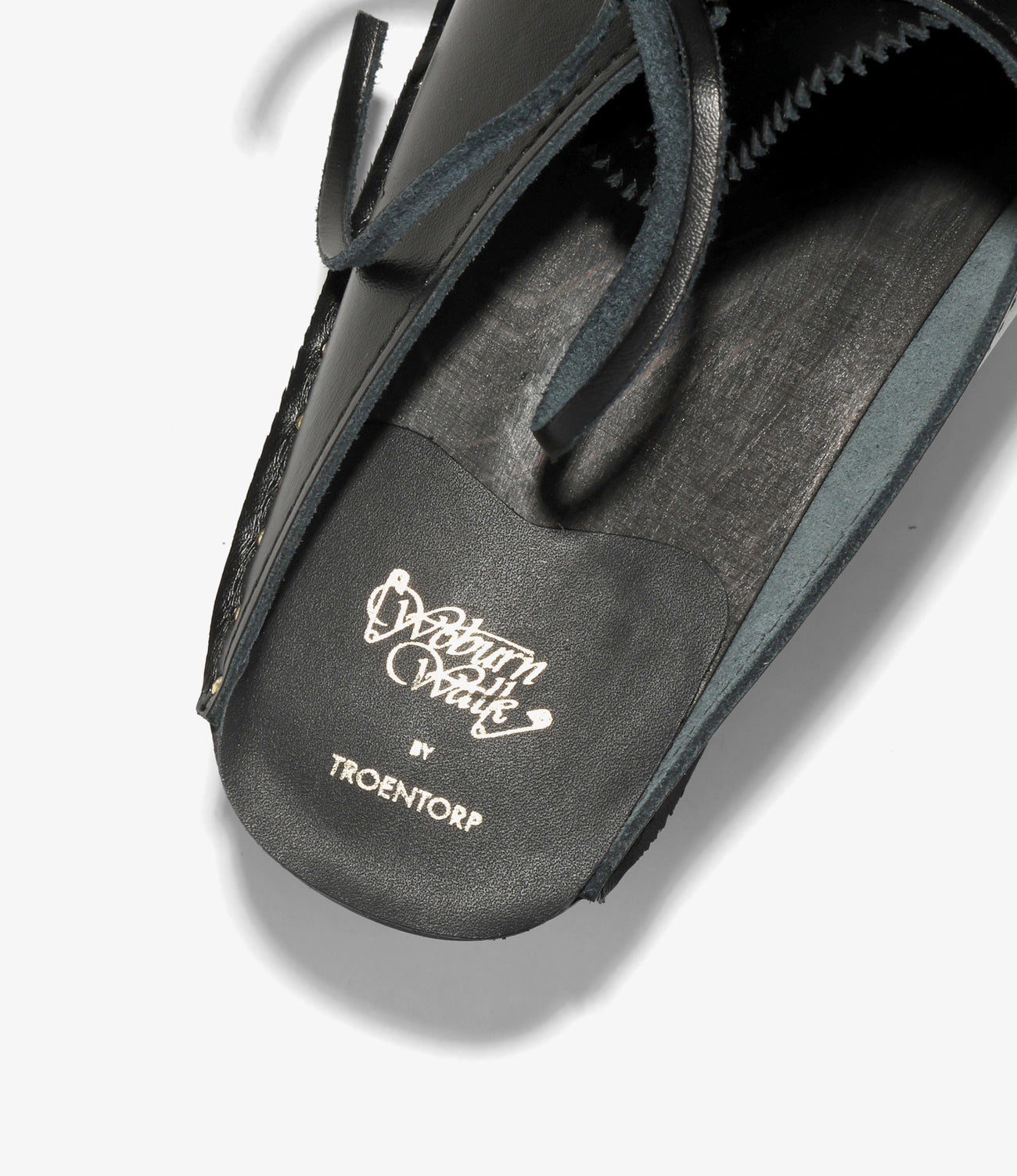 NEPENTHES LONDONがプロデュースする〈WOBURN WALK〉と、スウェーデンの老舗クロッグメーカー〈TROENTORP〉のコラボレーションモデル。クラシックなクロッグのアッパーに、レザーレースのデザインを加えた一足です。アッパー、フットベット、アウトソールのカラーリングはすべてブラックに統一し、特徴的なネイル(釘)やヒールロゴのゴールドが映えるデザイン。シュータンにはピンキングの装飾が施されています。伝統的なルックスを活かしつつ、デザイン性をプラスした仕上がりです。