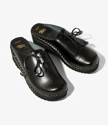 NEPENTHES LONDONがプロデュースする〈WOBURN WALK〉と、スウェーデンの老舗クロッグメーカー〈TROENTORP〉のコラボレーションモデル。クラシックなクロッグのアッパーに、レザーレースのデザインを加えた一足です。アッパー、フットベット、アウトソールのカラーリングはすべてブラックに統一し、特徴的なネイル(釘)やヒールロゴのゴールドが映えるデザイン。シュータンにはピンキングの装飾が施されています。伝統的なルックスを活かしつつ、デザイン性をプラスした仕上がりです。