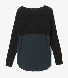 ショートスリーブTと5部袖Tの2枚がセットになったユニットTシャツ。半袖Tシャツのベースは強撚でドライタッチな糸をランダムな針抜きリブに織り上げた透け感のある素材を、5部袖Tシャツはソフト仕上げでふっくら柔らかい風合いで、横伸縮が優れているフライス地を採用しました。シンプルながらも袖口や裾にレタスエッジを効かせ、背面センターには3本針のラインを効かせるなどさりげないポイント。袖口をロールアップしてアクセントを付けたり、内・外どちらをレイヤードしても万能なトップス。