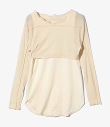 ショートスリーブTと5部袖Tの2枚がセットになったユニットTシャツ。半袖Tシャツのベースは強撚でドライタッチな糸をランダムな針抜きリブに織り上げた透け感のある素材を、5部袖Tシャツはソフト仕上げでふっくら柔らかい風合いで、横伸縮が優れているフライス地を採用しました。シンプルながらも袖口や裾にレタスエッジを効かせ、背面センターには3本針のラインを効かせるなどさりげないポイント。袖口をロールアップしてアクセントを付けたり、内・外どちらをレイヤードしても万能なトップス。